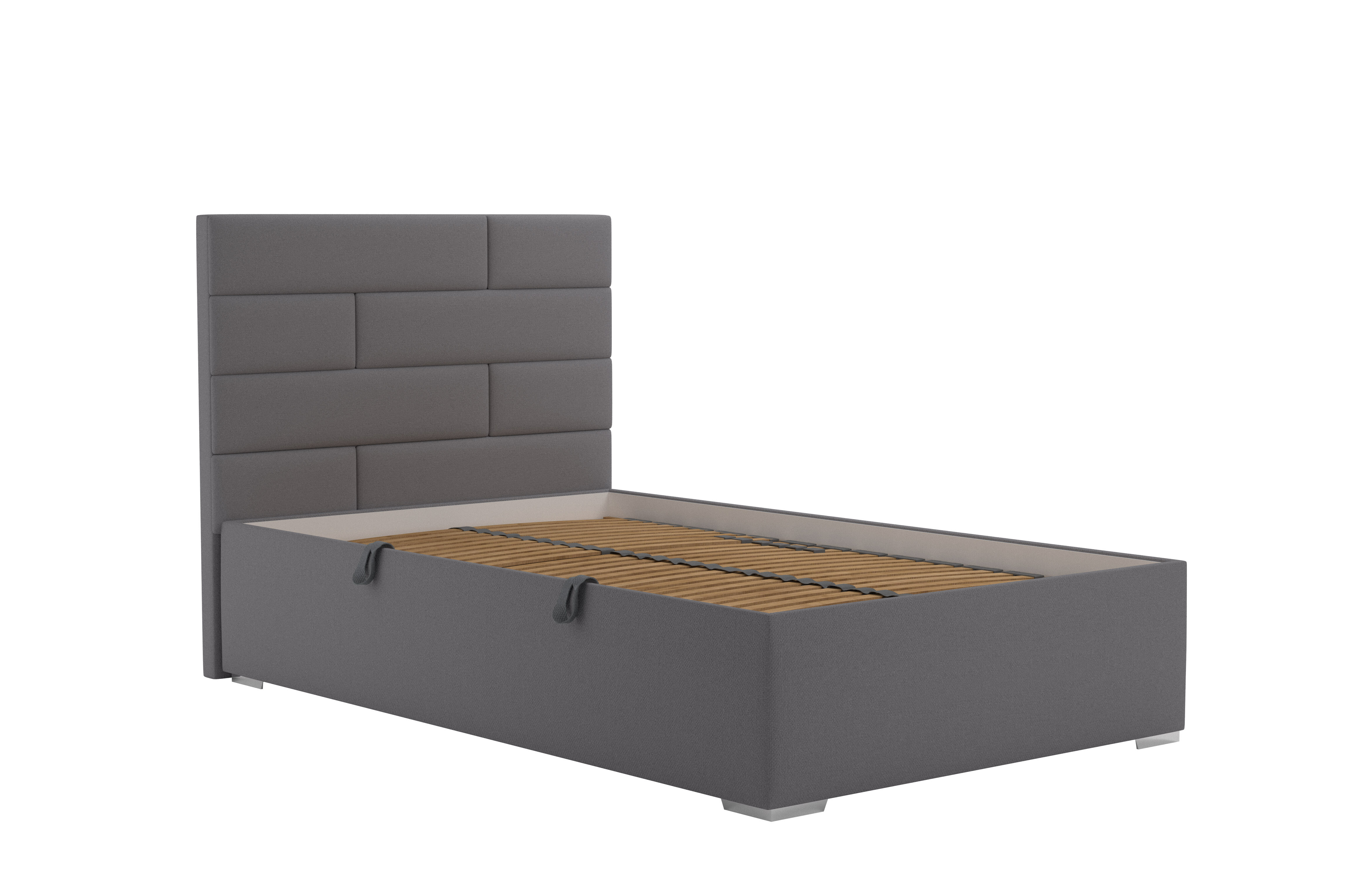 Postel je nabízena s elegantními dřevěnými nožkami o výšce 3,5 cm v potahové látce dle výběru. Postel disponuje úložným prostorem. Doporučená nosnost roštu 130 kg. Výška lehací plochy bez matrace 37,5 cm.