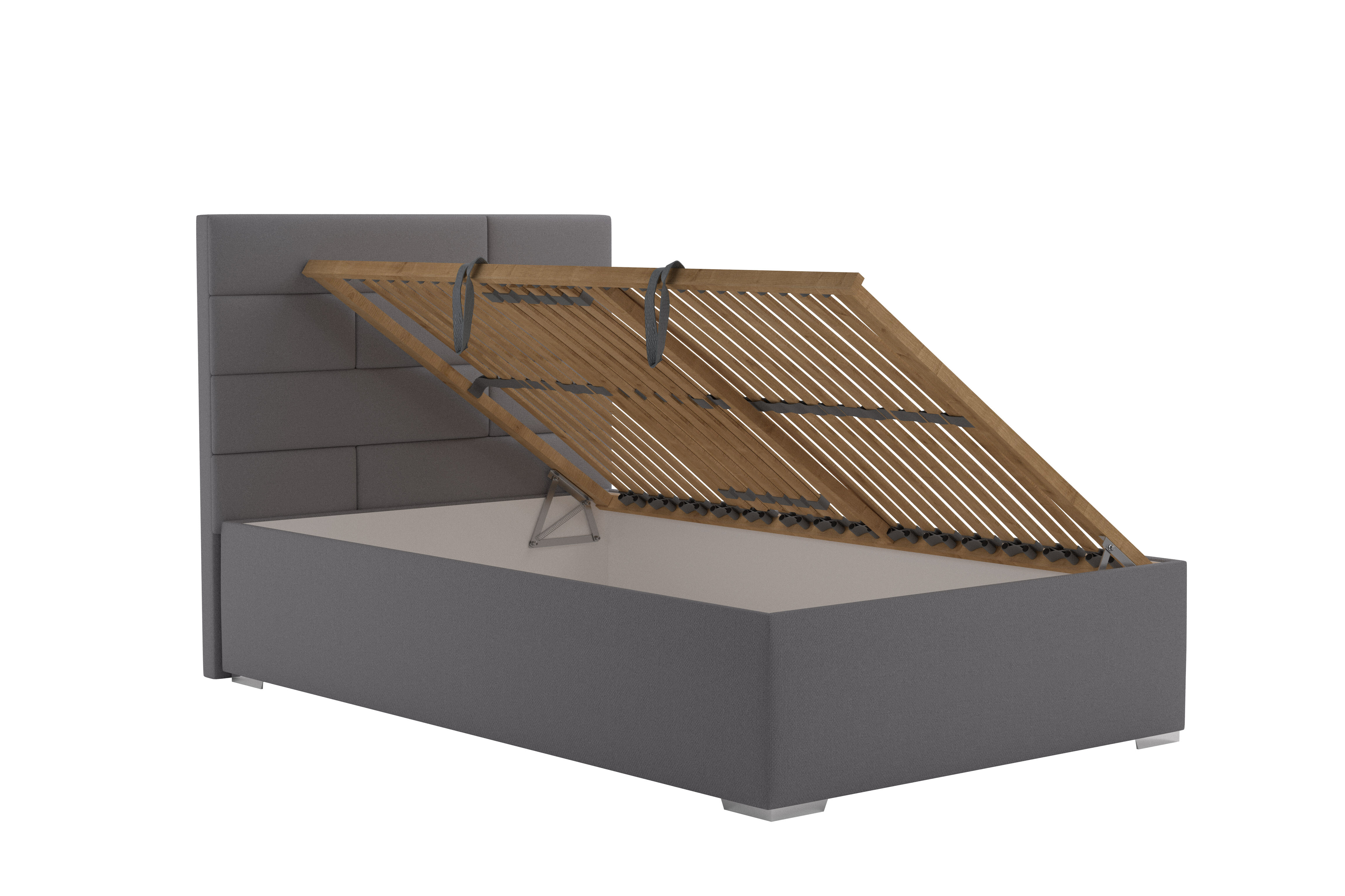 Postel je nabízena s elegantními dřevěnými nožkami o výšce 3,5 cm v potahové látce dle výběru. Postel disponuje úložným prostorem. Doporučená nosnost roštu 130 kg. Výška lehací plochy bez matrace 37,5 cm.