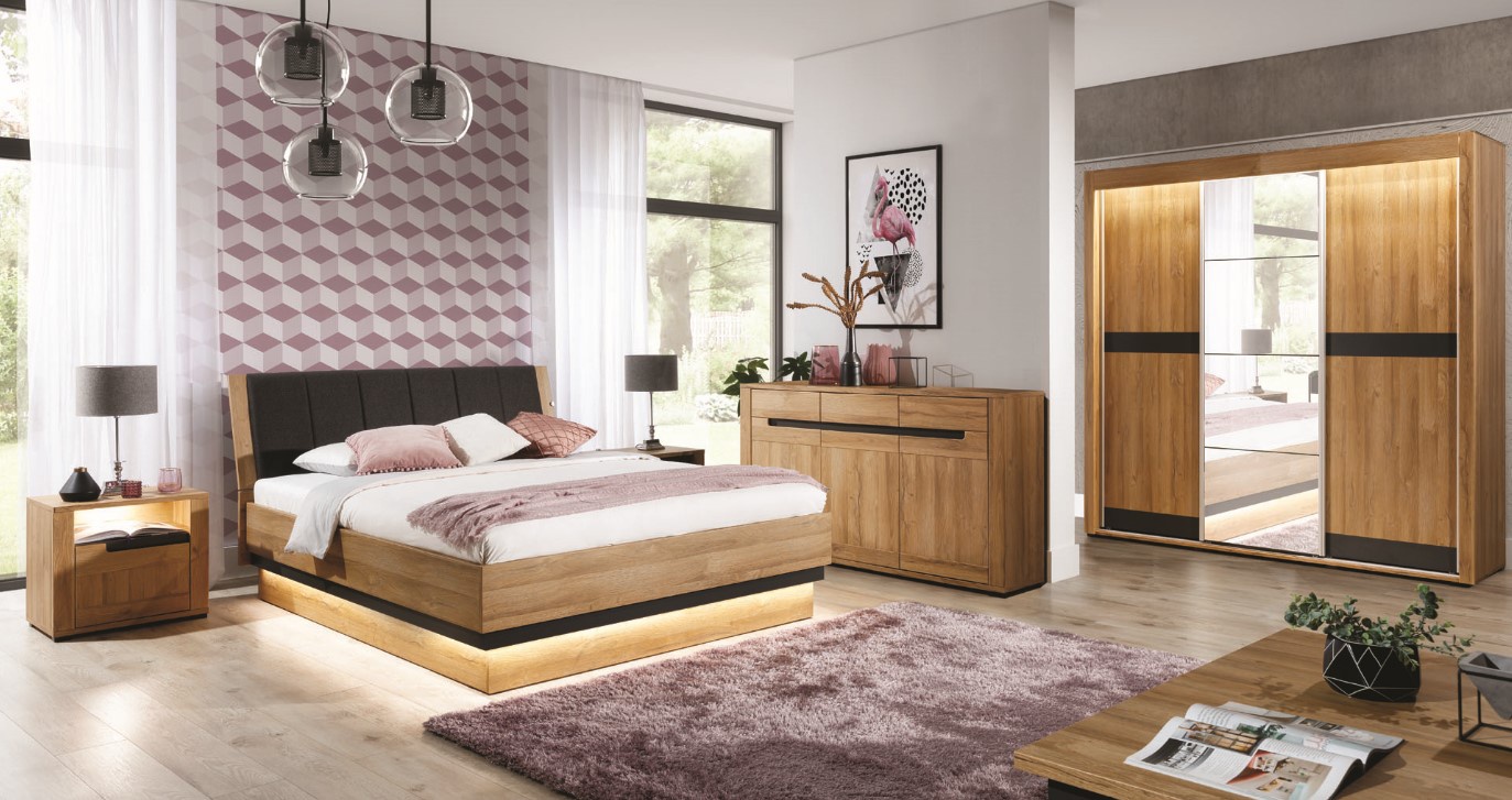 Moderní postel má korpus vyrobený z lamina a MDF o síle 16 mm, s ABS hranami v provedení dub granson/ grafit.. Postel je dodávána bez roštu a matrace. Má čalouněné čelo v hnědé barvě. Zboží dodáváme v demontu.