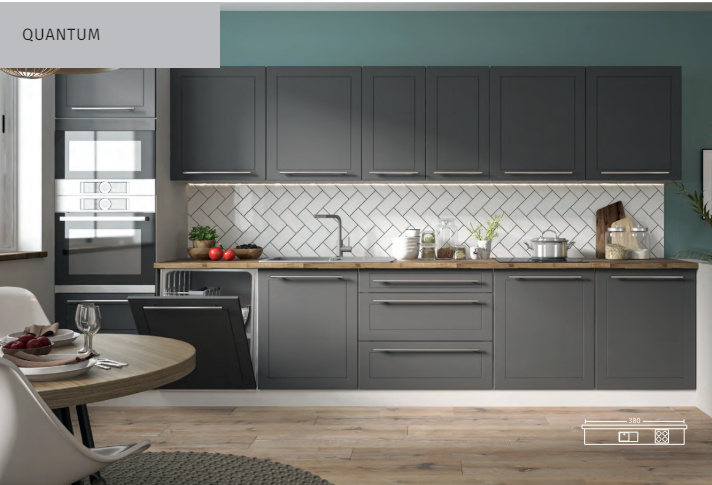 Kuchyně QUANTUM nadčasového designu se hodí do klasických i moderních interiérů. Korpus je vyroben z kvalitního lamina v tl.18 mm v dezénu dle výběru, odolné proti oděru a škrábancům. Dvířka z materiálu MDF jsou oblepena PVC fólií s matnou, vysoce kvalitní strukturou. Úchytky na dvířkách RELLING. Jemný profil frézování dvířek dodává kuchyni velmi elegantní nádech. Dolní skříňky kuchyně QUANTUM jsou dodávány bez pracovní desky a bez spotřebičů. Zboží dodáváme v demontu.