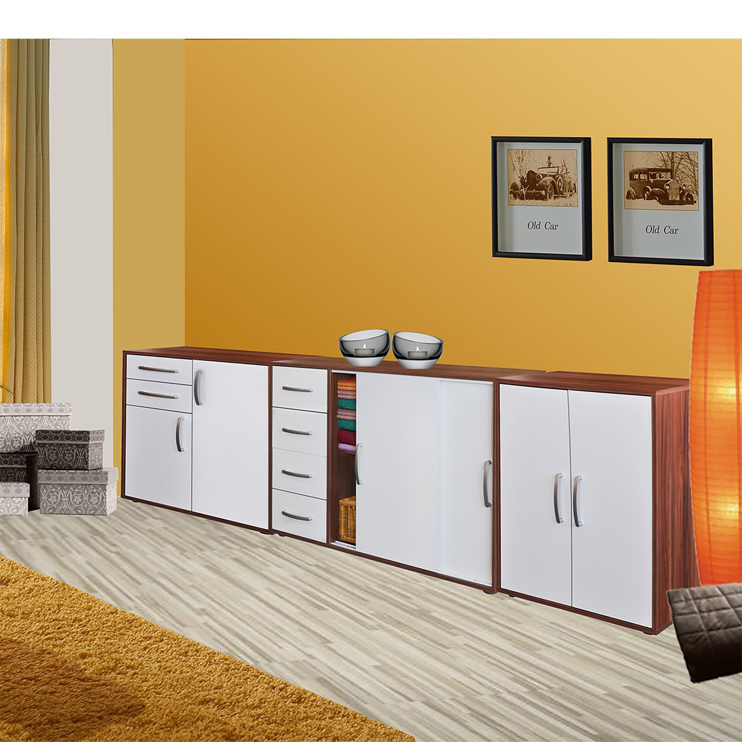 Prádelník 61504 v barevném provedení ořech/bílá se jednoduše stane žádaným oživením vašeho pokoje. Z jednotlivých komod v provedení ořech/bílá poskládáte praktickou sestavu, která vám bude sloužit stejně dobře jako obrovská skříň. Prádelník 61504 obsahuje dvě úzké zásuvky a dva prostory opatřené dvířky vhodné pro uložení věcí. Do zásuvek poskládáte jak prádlo, tak nejrůznější drobnosti. V prostoru za dvířky se vždy nachází police, z toho jedna je variabilní. Zásuvky mají hloubku 30 cm. Zboží je dodáváno v demontu.