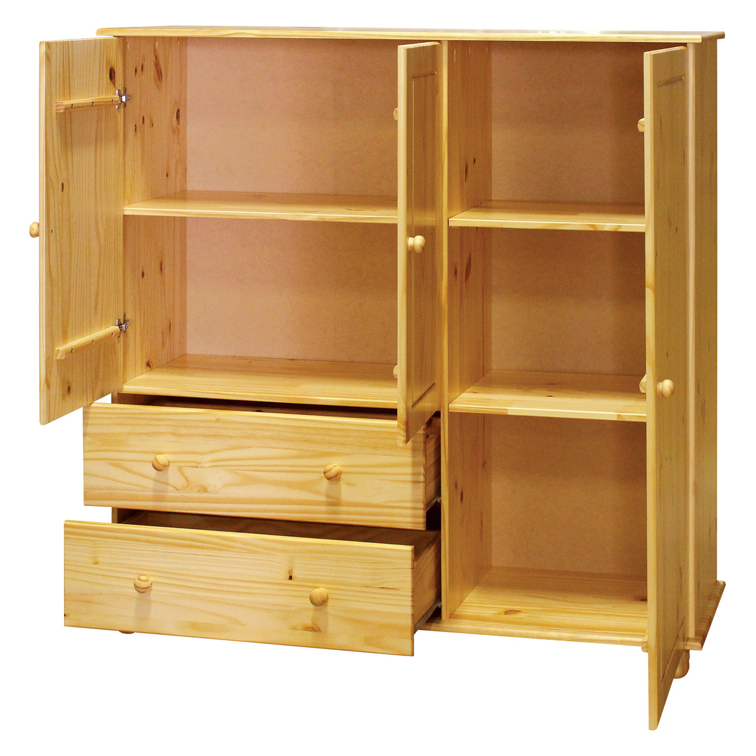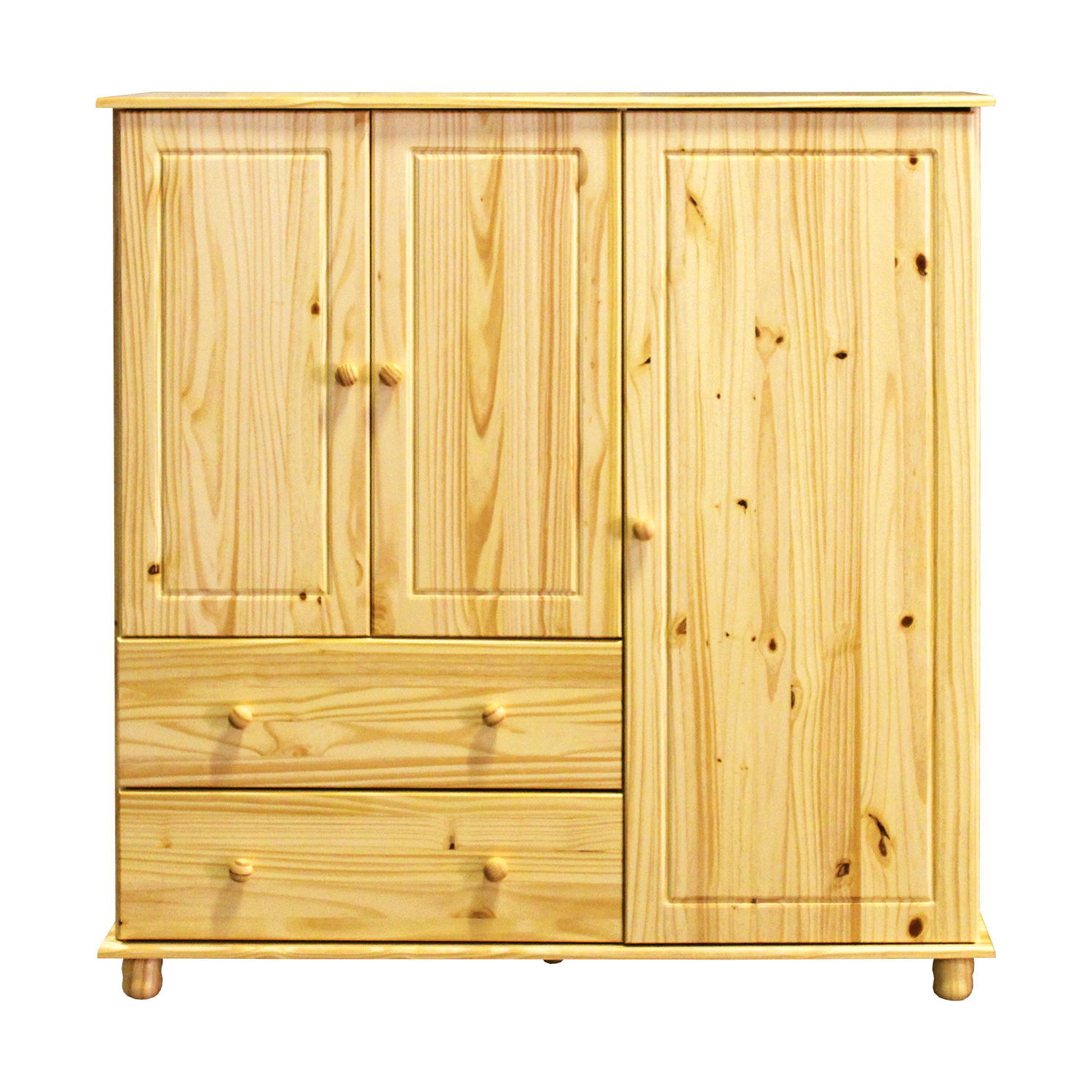 Prádelník 8018 v provedení masiv borovice je prakticky rozdělen. V širší části je prostor s jednou variabilní policí opatřený dvířky, pod ním se pak nachází dvě široké zásuvky s kovovými pojezdy, v užším prostoru naleznete dvě variabilní police. Do dvou úložných prostorů snadno poskládáte nejrůznější oblečení, místa na doplňky je dostatek v širokých zásuvkách. Třídveřový prádelník lze využít i na ložní prádlo, ručníky, osušky a deky, ušetří vám tedy důležitý prostor ve skříni. Zboží je dodáváno v demontu.