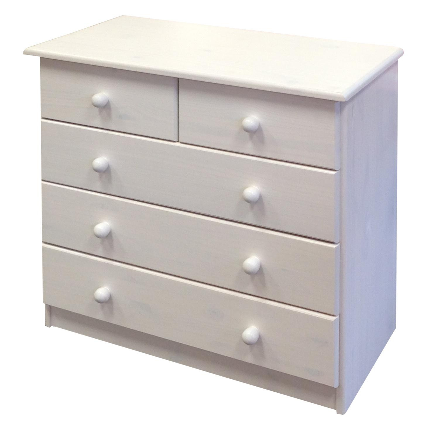 Pokud nechcete zaplnit celý prostor vysokými skříněmi, doporučujeme vám praktickou komodu či prádelník. Prádelník 918 z masivu borovice v provedení bílý lak obsahuje dvě úzké a tři široké zásuvky s kovovými pojezdy. Hloubka zásuvek je 32,5 cm. Zboží je dodáváno v demontu.