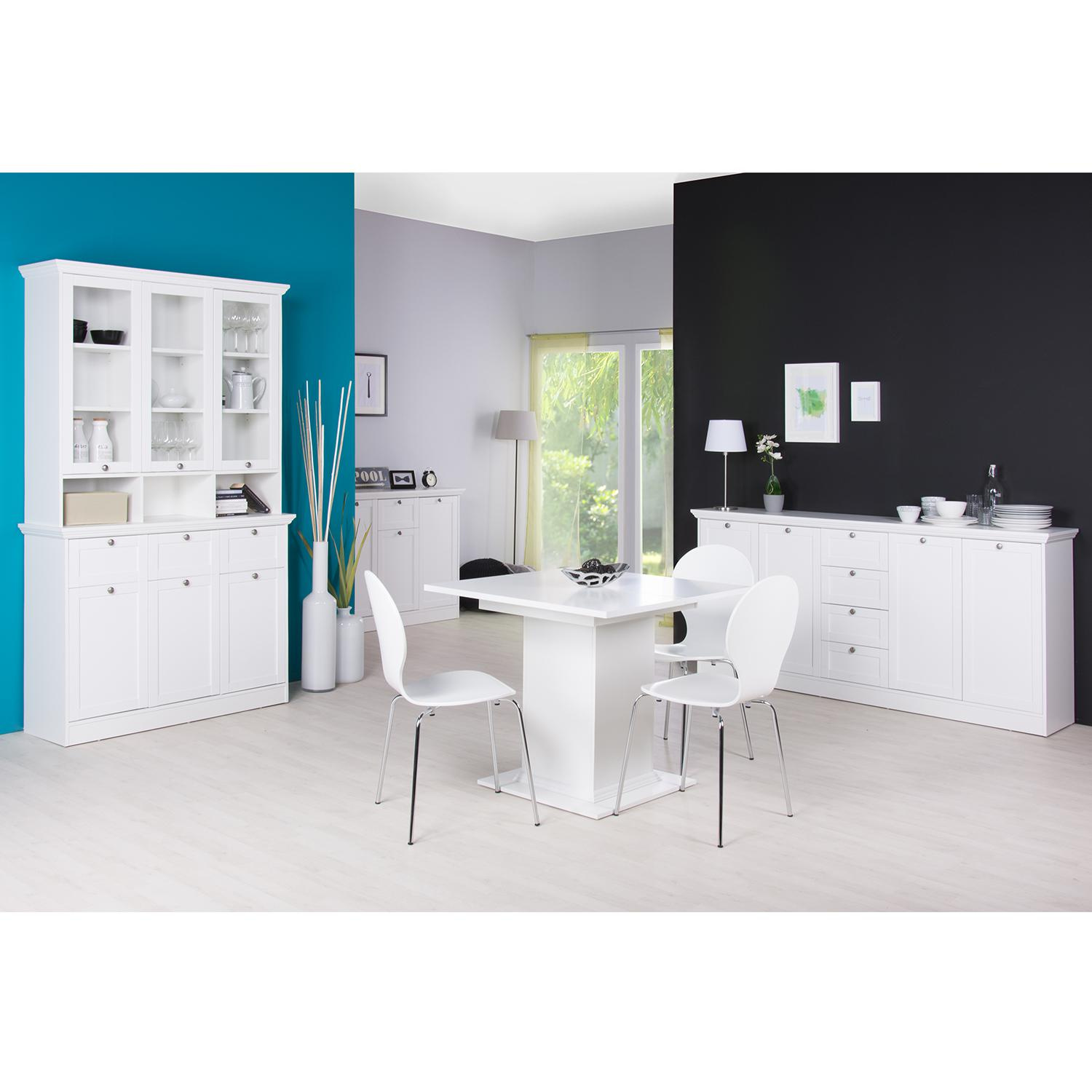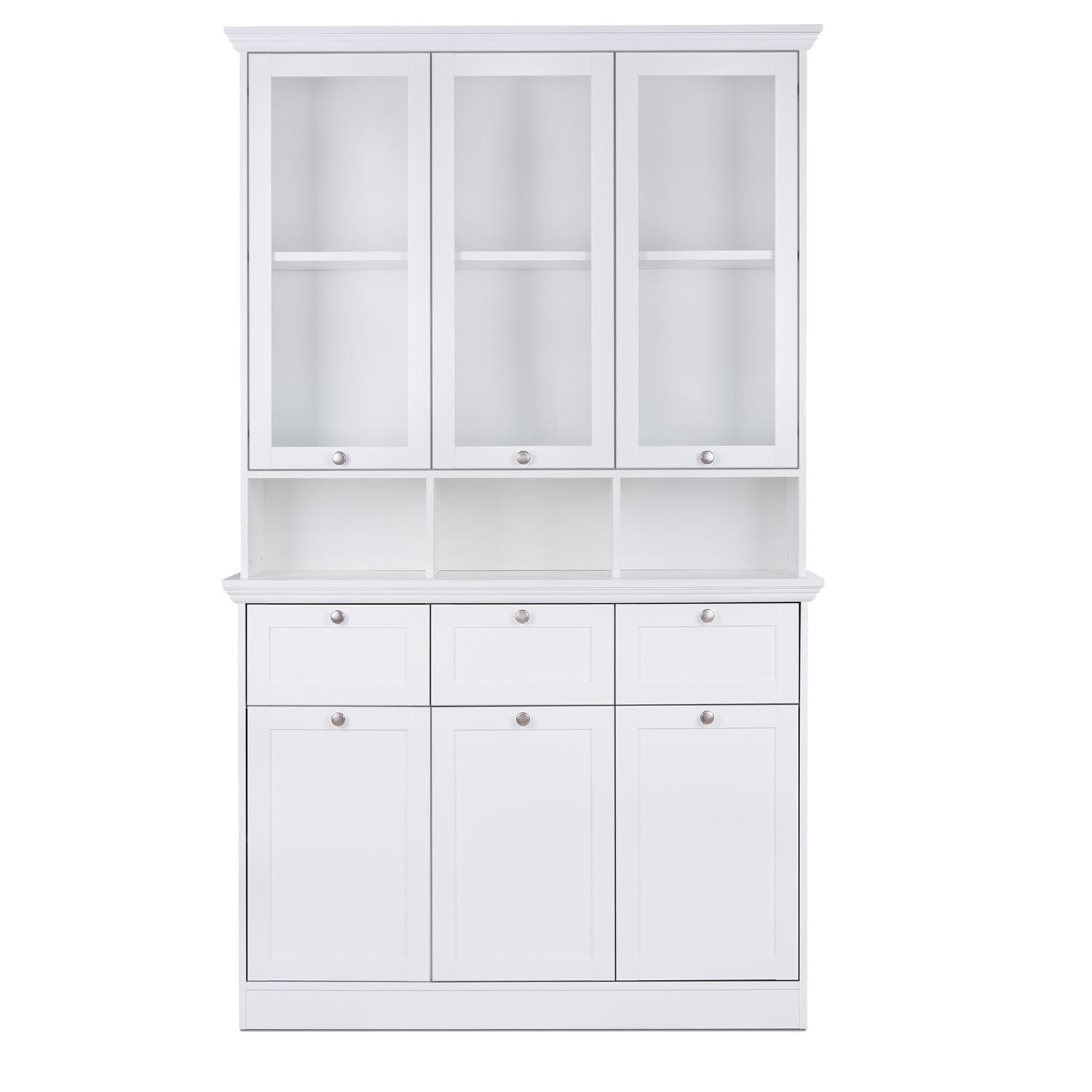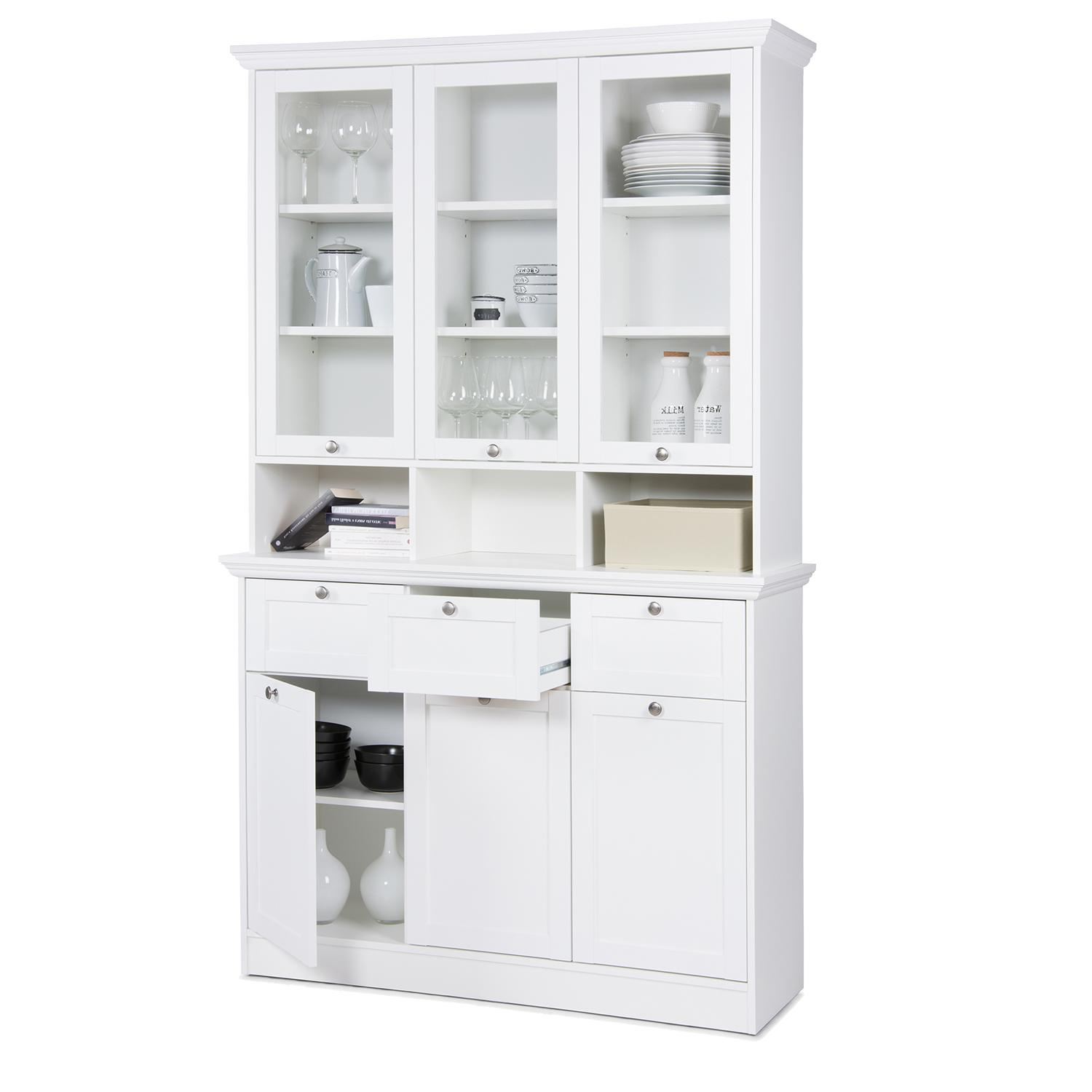 Příborník LANDWOOD 50 je vyroben z materiálu MDF/lamino v bílé barvě. Disponuje třemi plnými a třemi prosklenými dvířky, třemi zásuvkami a třemi nikami. Je součástí sestavy LANDWOOD. Zboží je dodáváno v demontu.