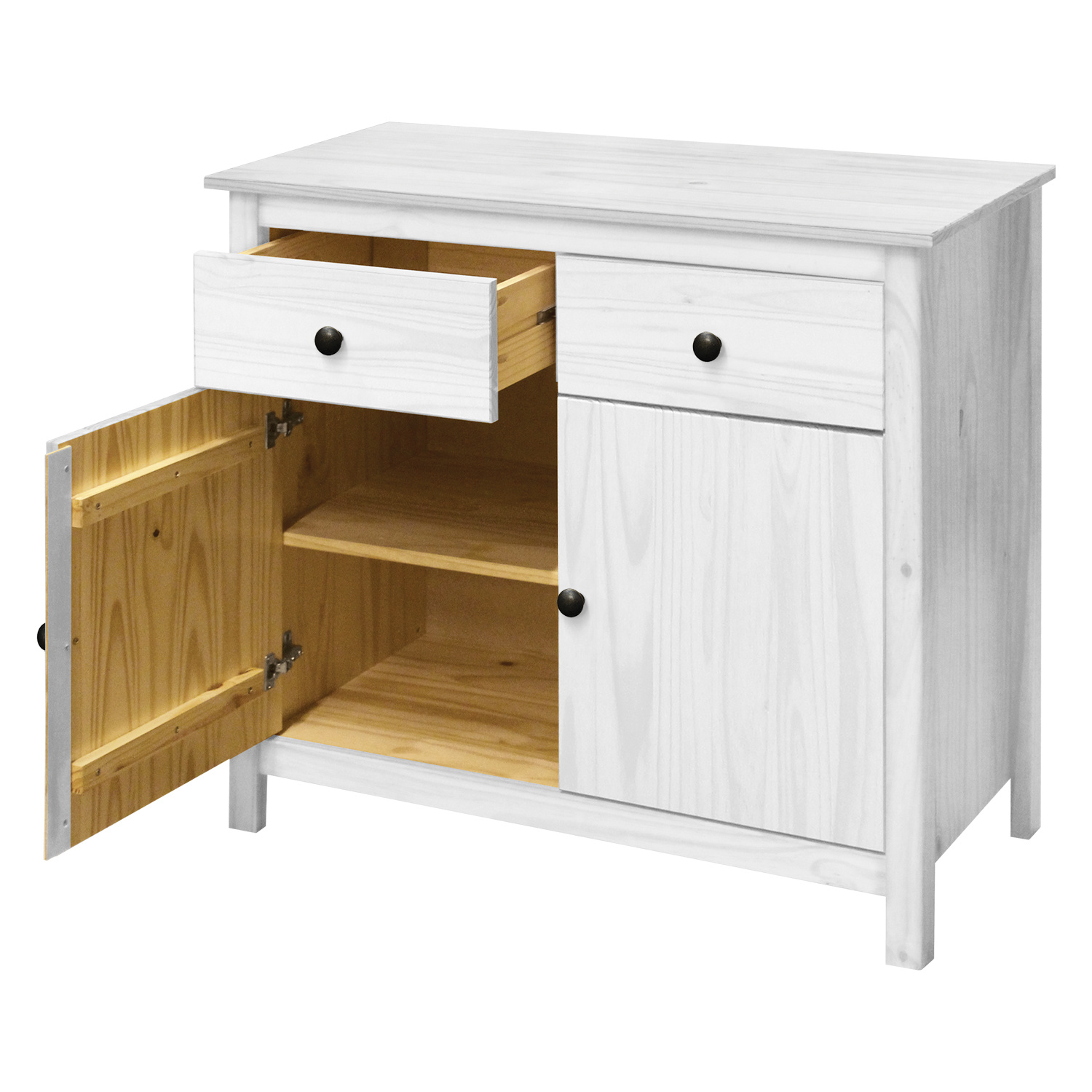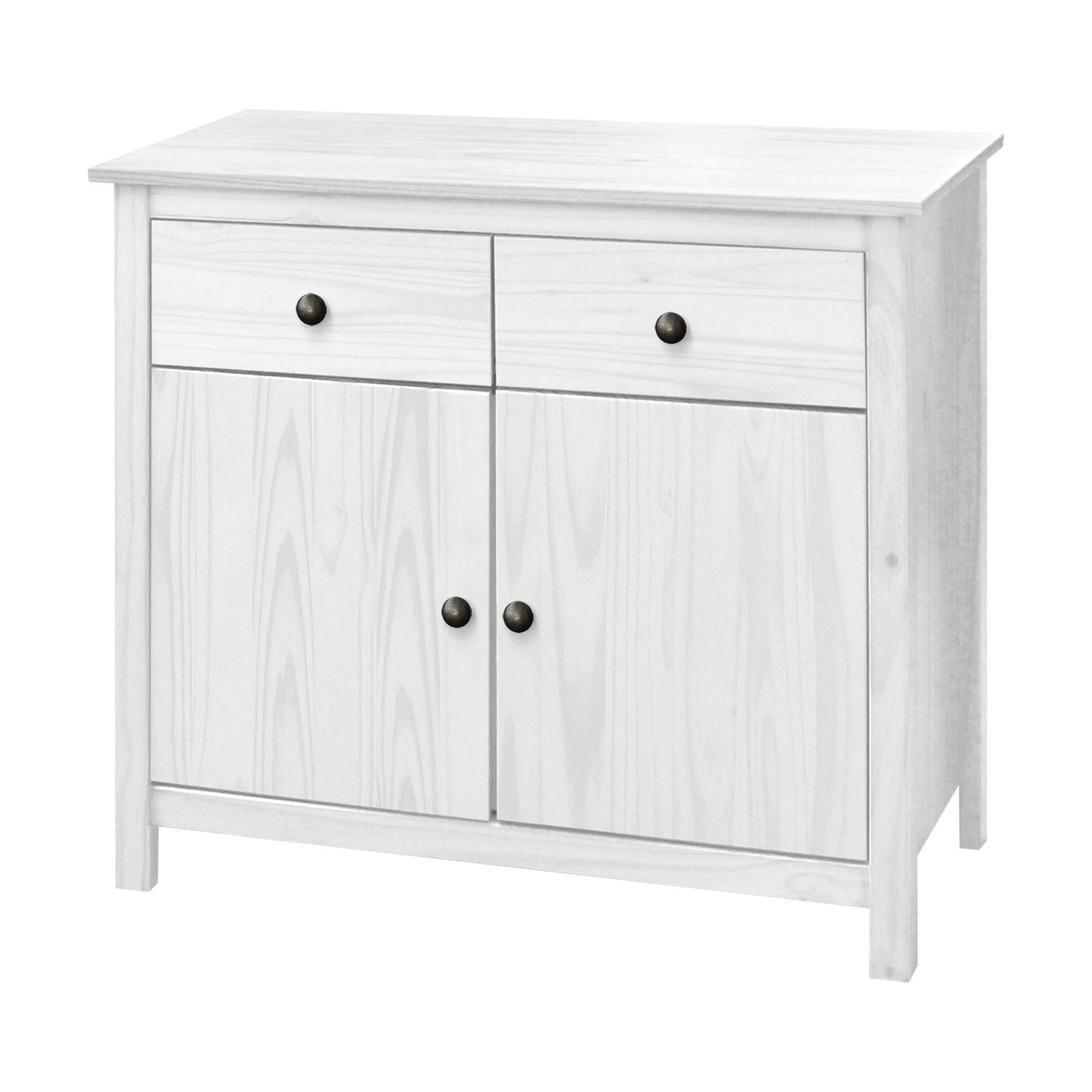 materiál masiv borovice, barevné provedení bílý lak kovové úchytky 2 zásuvky s kovovými pojezdy, 2 plné dveře, 1 police vhodný doplněk nástavec 8096BK