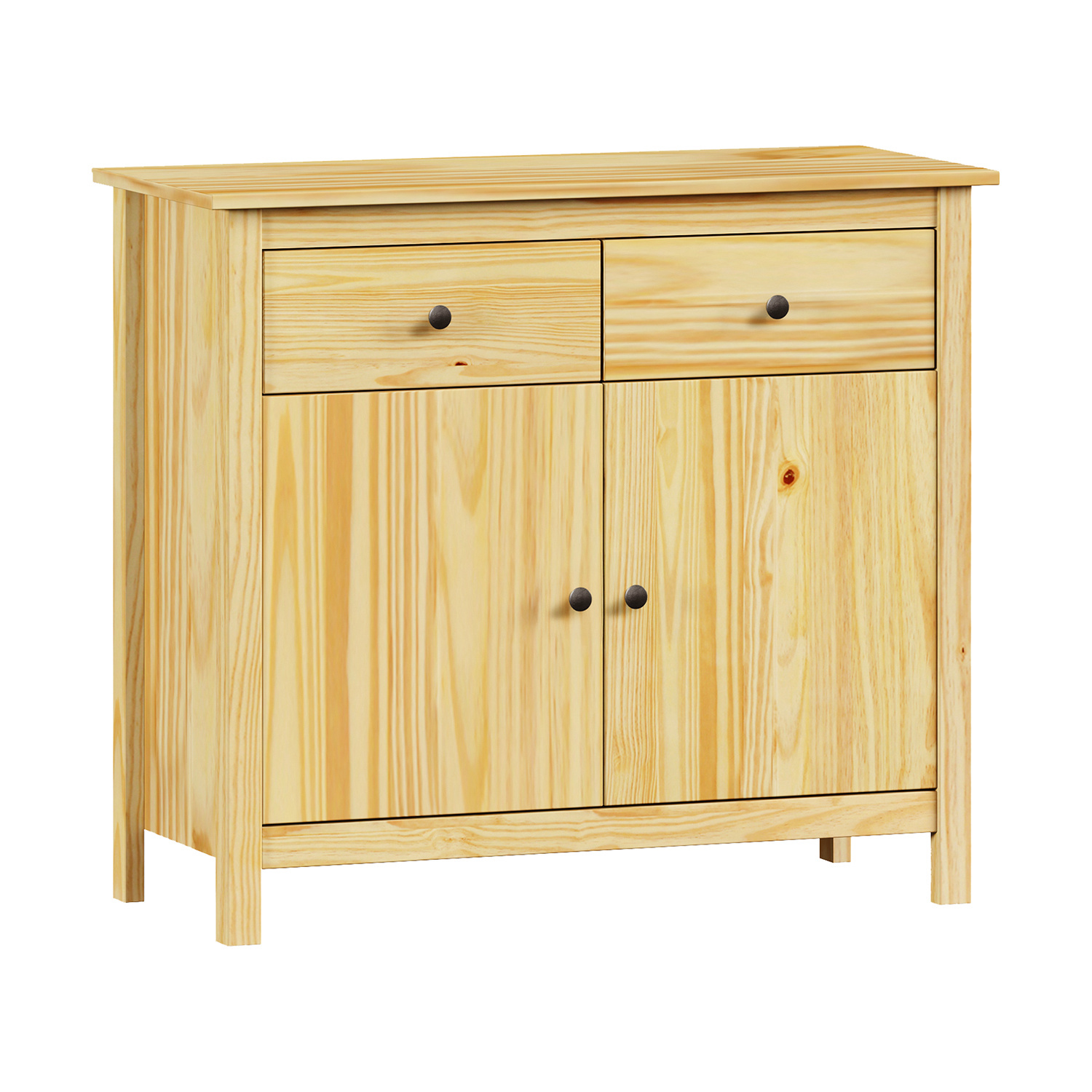 materiál masiv borovice, lakované provedení kovové úchytky 2 zásuvky s kovovými pojezdy, 2 plné dveře, 1 police vhodný doplněk nástavec 8096K