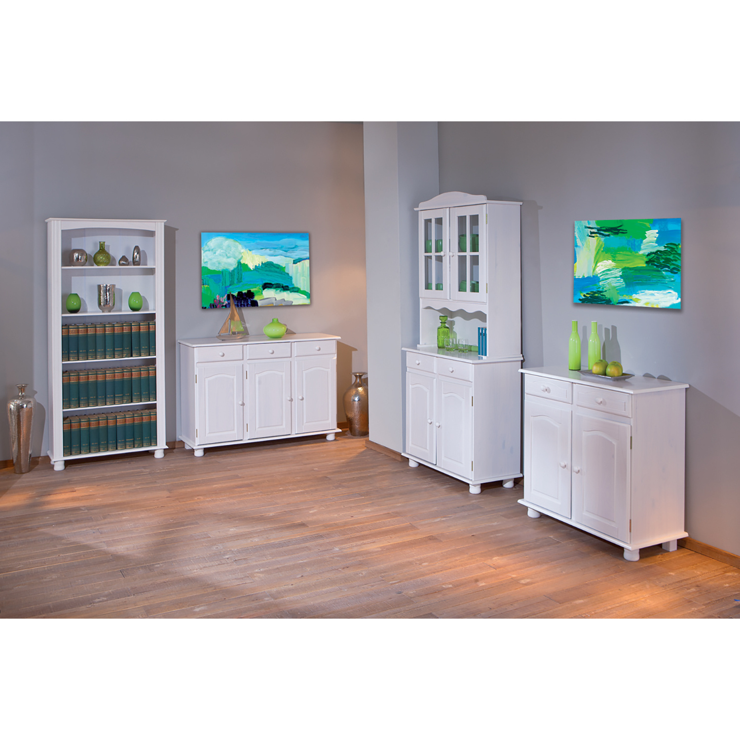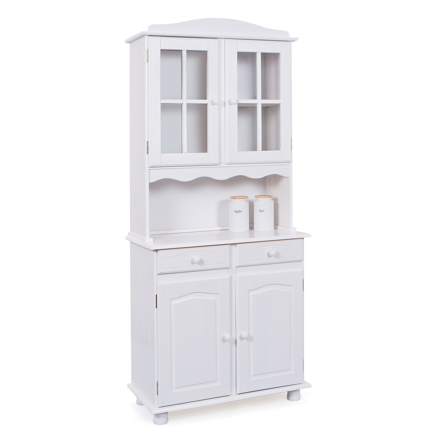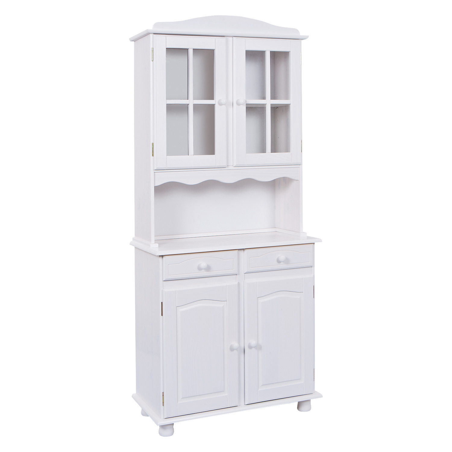 materiál masiv borovice, barevné provedení bílý lak v horní části 2 prosklená dvířka ve spodní části 2 plná dvířka, 2 zásuvky s kovovými pojezdy hloubka horní části 32 cm sestava příborníku LOVI a nástavce LOVI PAMINA, LOVI, ABACO, LIVIO, ALICANTE, VALENCIA, TOSCANA, SIENA