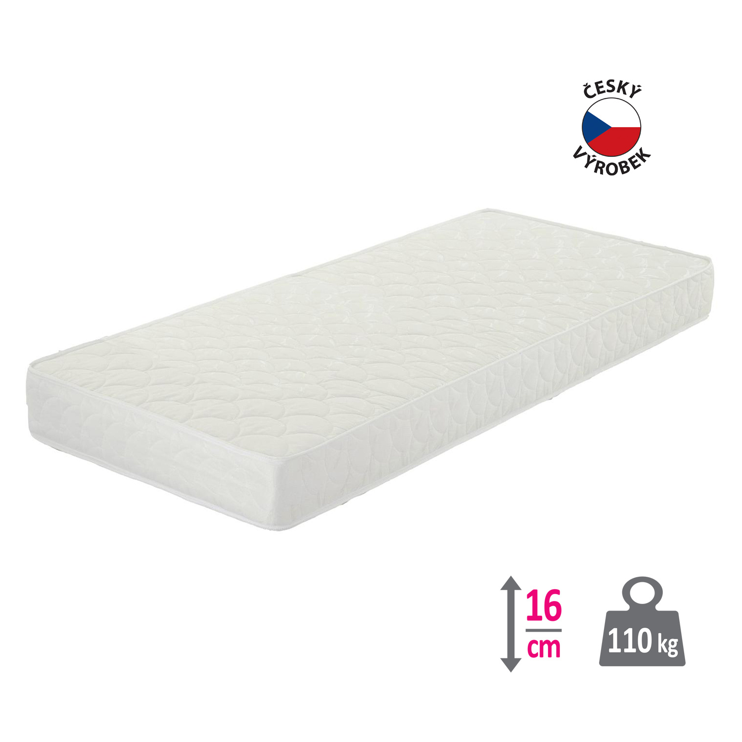 Oboustranná matrace - letní a zimní strana je potažena pevnýmpěnovým potahem. Matrace obsahuje jádro z bonelových pružin oboustranně obložené prodyšnou separační vrstvou, která zabraňuje proříznutí pěny pružinami. Doporučená nosnost do 110 kg.