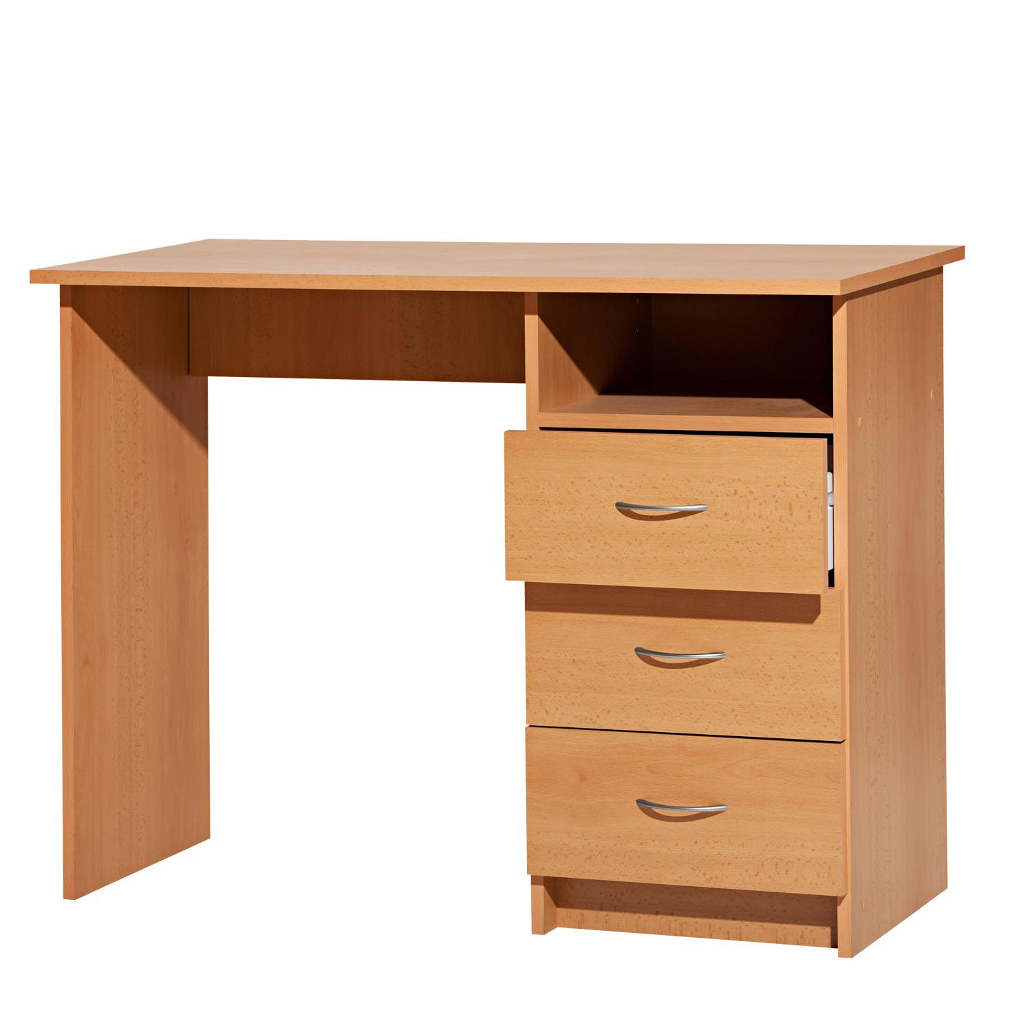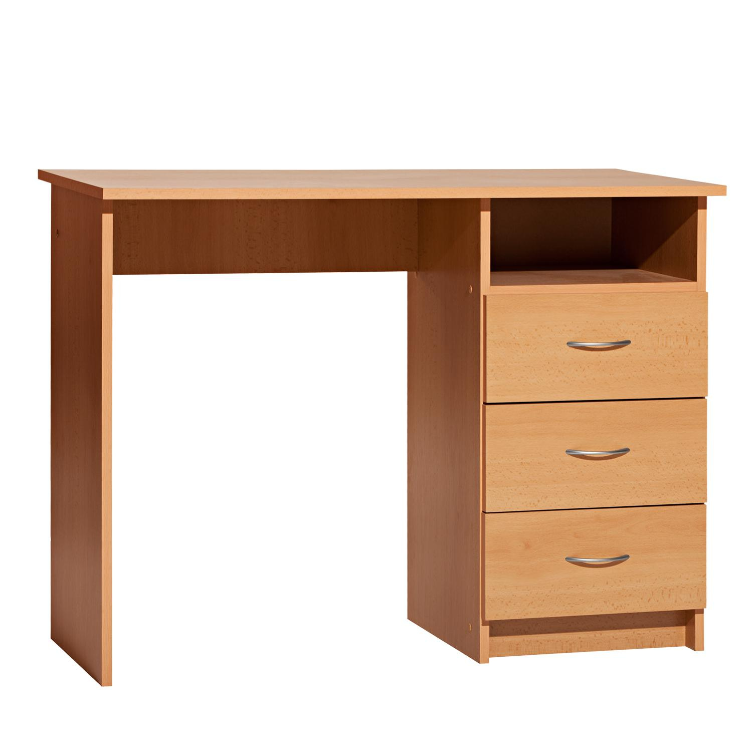 Počítačový stůl je vyroben z laminované dřevotřísky v barevném provedení buk. Psací stůl obsahuje tři praktické zásuvky. Montáž stolu je možná pouze na pravou stranu. Zboží dodáváme v demontu.