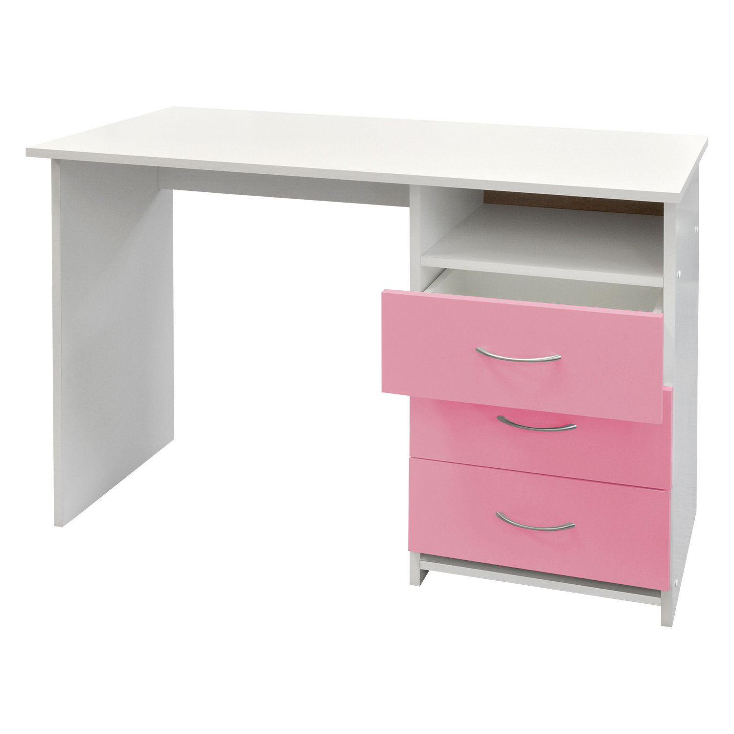 Psací stůl je vyroben z laminované dřevotřísky v barevné kombinaci bílá, růžová. Korpus stolu bílý, zásuvky v růžové barvě. Stůl obsahuje tři zásuvky, nad kterými je police. Montáž zásuvek je možná pouze na pravou stranu. Zboží dodáváme v demontu.