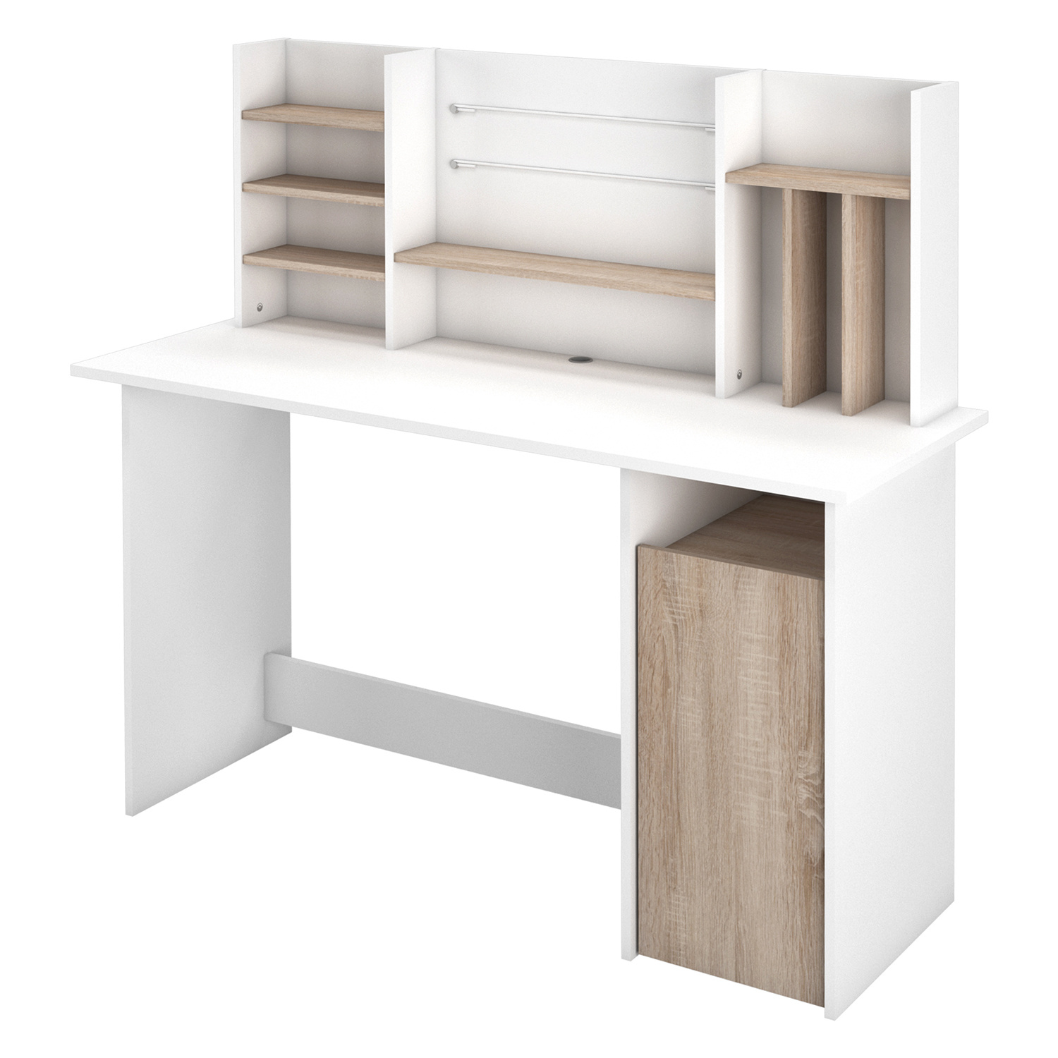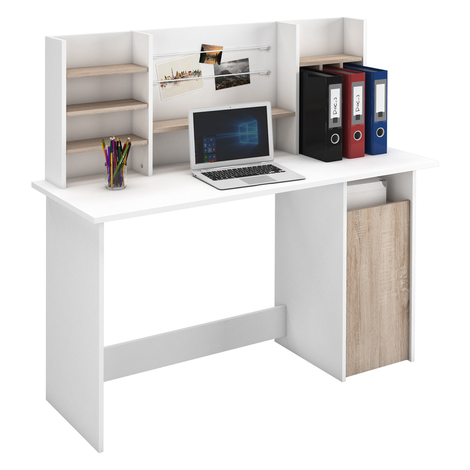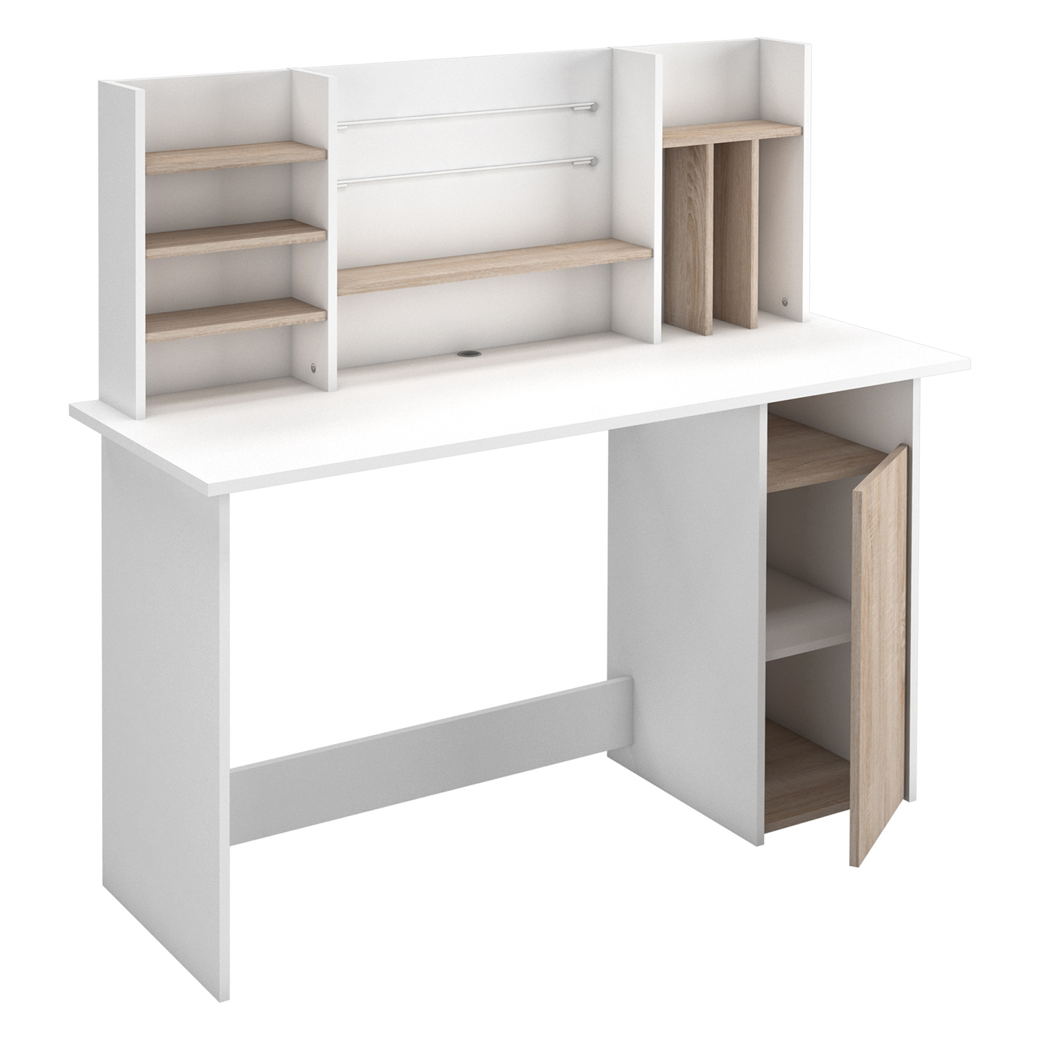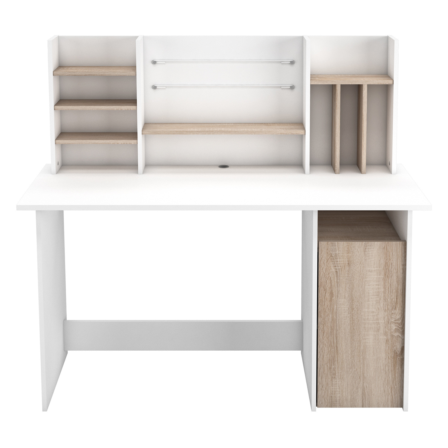 Psací stůl z lamina v barevném provedení dub sonoma/bílá. Psací stůl má 1 dvířka s variabilní policí, na zadní části závěsy a police o hloubce 13 cm. Zboží dodáváme v demontu.
