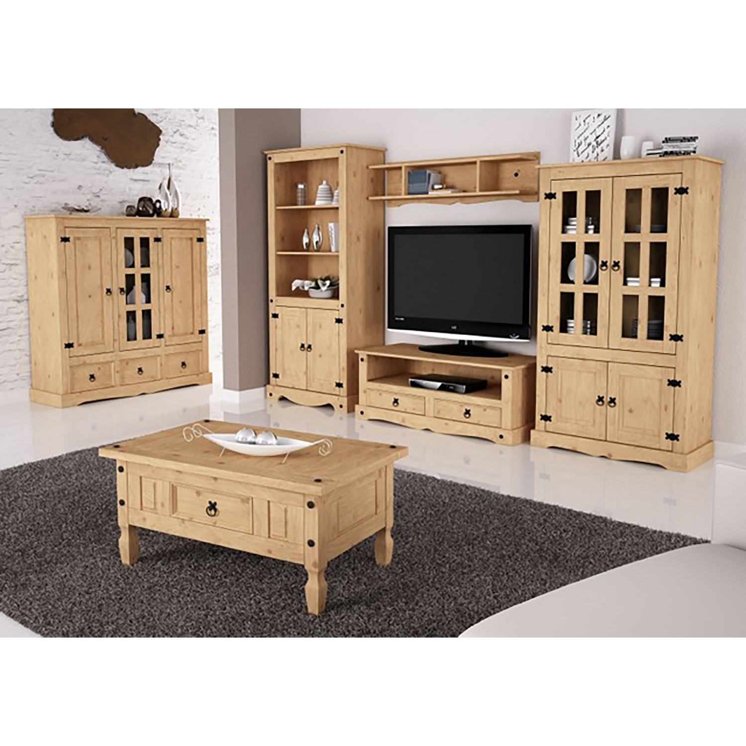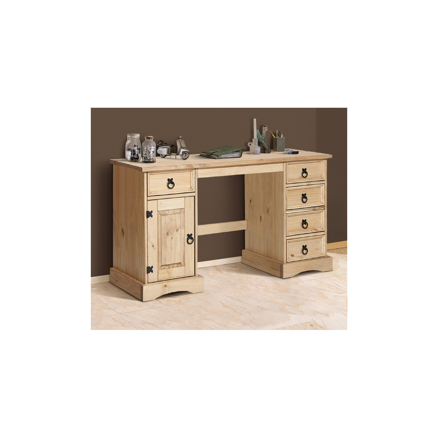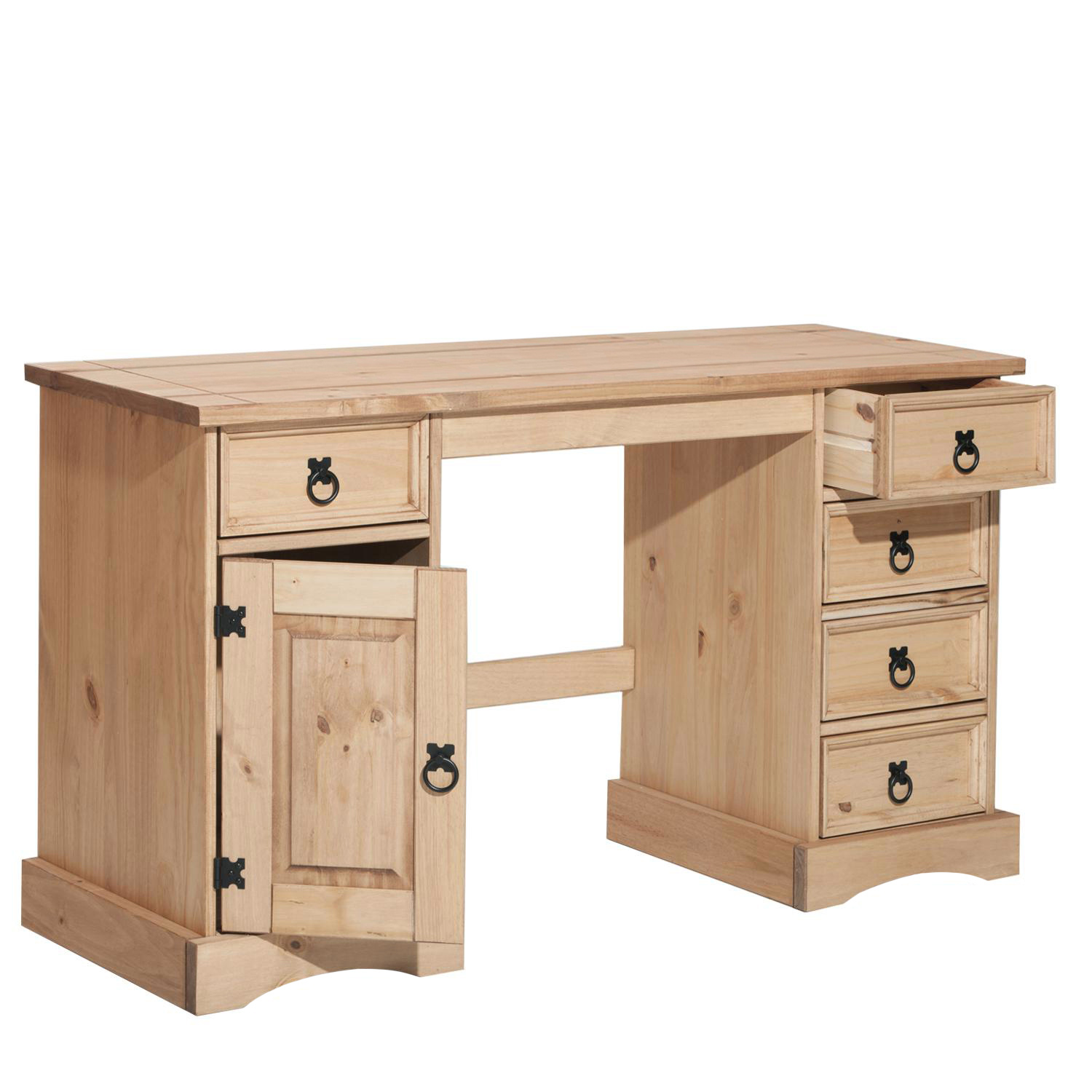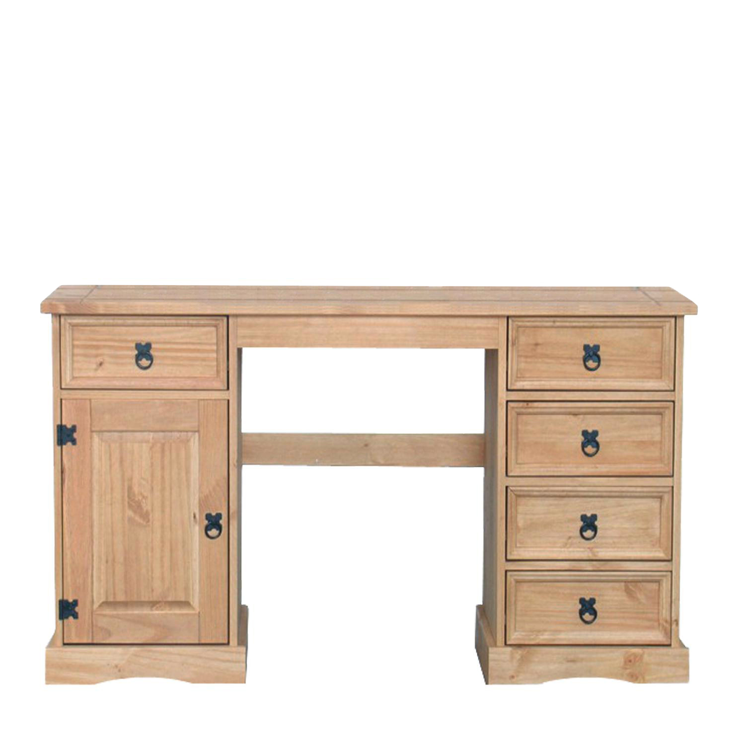 Prostorný psací stůl je zhotoven z masivní borovice, voskované provedení v medovém odstínu. Obsahuje 5 malých zásuvek, 1 dvířka, kovové ozdobné úchytky. Je součastí sestavy Corona. Zboží dodáváme v demontu.