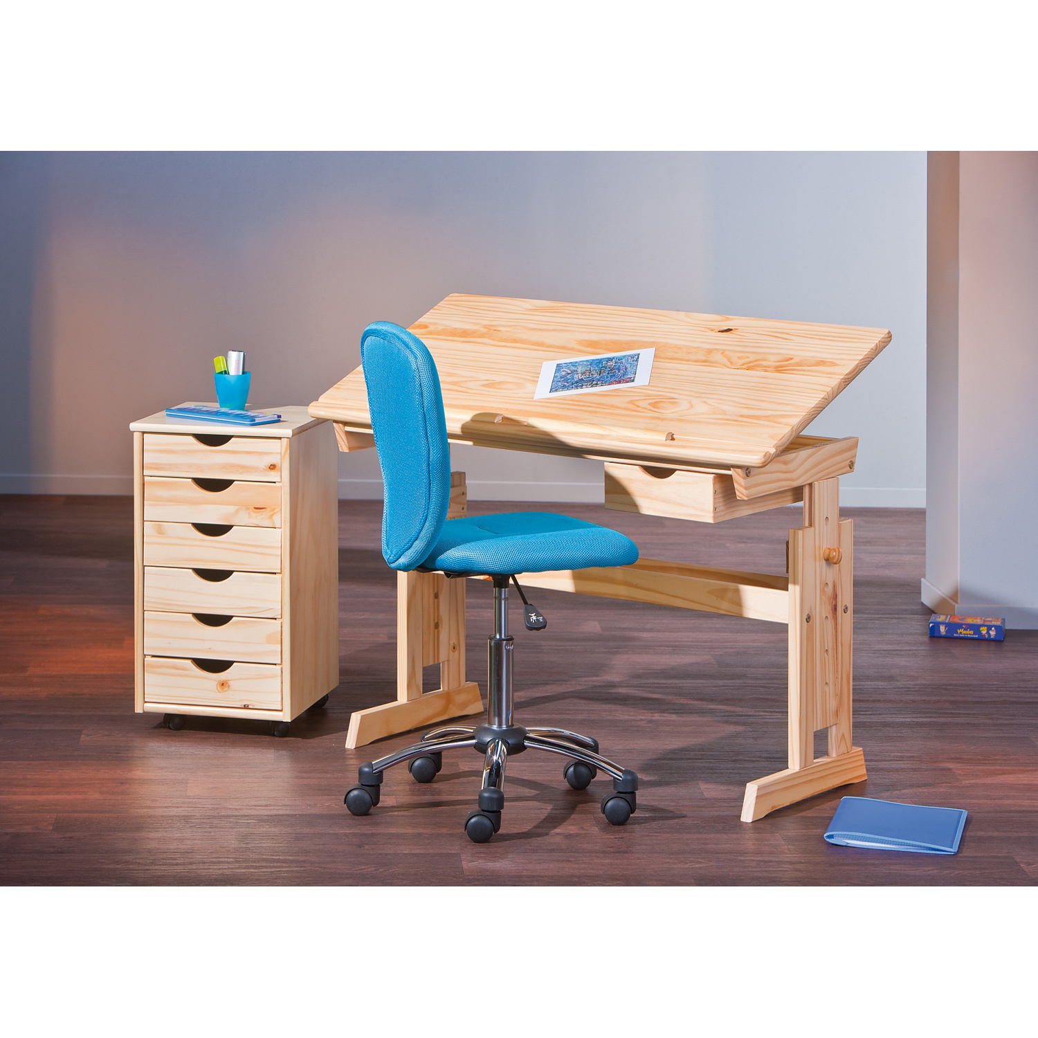 Rostoucí stůl Julia je vyroben z lakovaného masivního borovicového dřeva. Deska stolu je sklápěcí a lze ji sklopit pod různými úhly ve výšce 63-96 cm. Díky nastavitelné výšce desky tento psací stůl nastavíte dle potřeby. Na pravé straně stolu je jedna zásuvka. Zboží je dodáváme v demontu