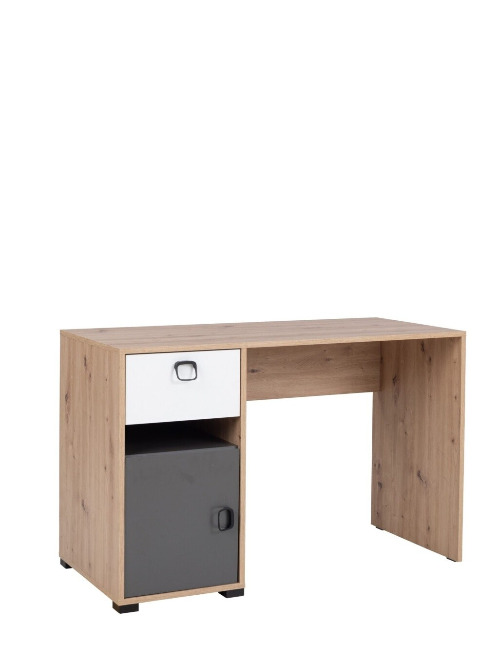 Psací stůl ze systému Kevin má konstrukci z lamina, tl. 16 mm a hrany ABS 0,6 mm. Konstrukce v dekoru dub artisan, přední díly v dekoru dub artisan/grafit/ bílý mat. Úchytky jsou kovové v černé barvě. Zboží dodáváme v demontu.