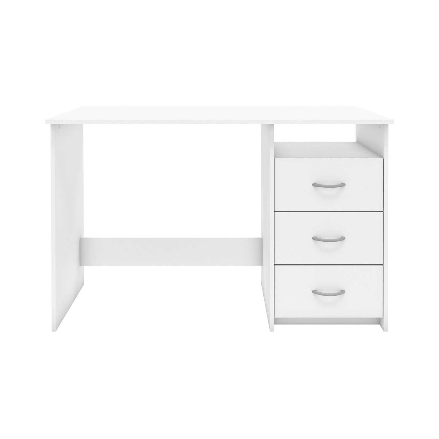 Psací stůl v barevném provedení perleťově bílá je vyroben z laminované dřevotřísky. Stůl má 3 zásuvky, které obsahují pojezdy s kuličkovými ložisky a nad nimi 1 polici (š/h/v) 40 × 38 × 13 cm. Montáž je možná na pravou i levou stranu. Zboží dodáváme v demontu bez dekorace.
