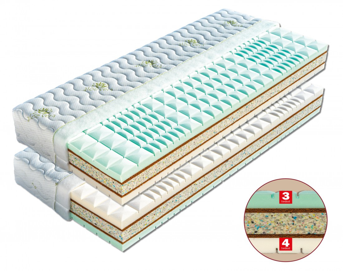 Tato pevná sendvičová matrace snese vysoké zatížení, a to až do váhy 160 kg. Střed jádra je tvořen plotnou pojeného polyuretanu ve výšce 7 cm. Nosné vrstvy ze dvou elastických vysoce kvalitních pěn MediFoam jsou podloženy vrstvou kokosového vlákna, které napomáhá zpevnění a provzdušnění matrace. Nosné vrstvy jsou ideálně odlehčené speciálním podélným a příčným průřezem zaručujícím optimální pohodlí pro každou část těla. Tato matrace je vhodná jen pro nepolohovací rošty. Matrace lze vybrat v potahu ÚPLET nebo ALOE VERA. V objednávce prosím uveďte Vámi vybraný potah. Výška matrace včetně potahu 22 cm. Matrace do hmotnosti 160 kg. K této matraci nabízíme jako dárek zdarma 1x polštář Lukáš.
