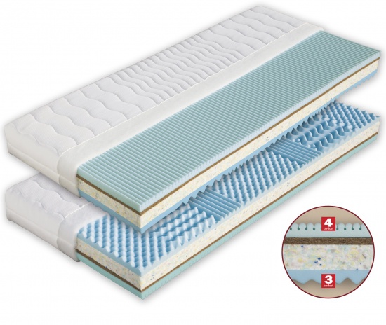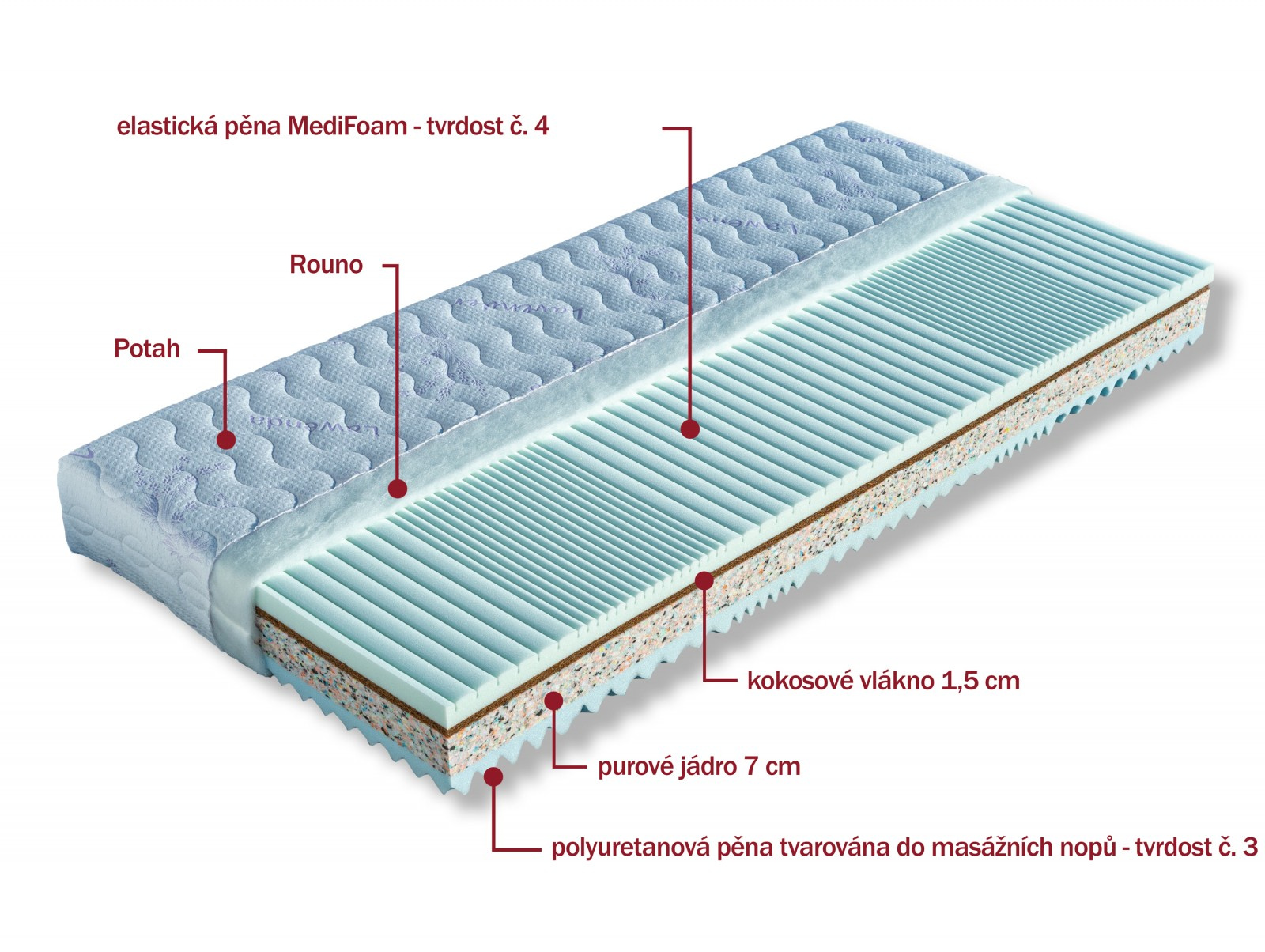 Sendvičová matrace s vynikajícími ortopedickými vlastnostmi. Střed jádra je tvořen pojeným polyuretanem ve výšce 7 cm a kokosovou vrstvou ve výšce 1,5 cm, která lépe provzdušní střed matrace. Nosná vrstva zabezpečuje dokonalé odvětrání díky speciálnímu řezu ve tvaru tzv. panáčků. Druhá vrstva je opatřena tvrzenou pěnou tvarovanou do masážních nopů. Matrace lze vybrat v potahu ÚPLET nebo ALOE VERA. V objednávce prosím uveďte Vámi vybraný potah. Výška matrace včetně potahu 17 cm. Matrace do hmotnosti 150 kg. K této matraci nabízíme jako dárek zdarma 1x polštář Lukáš.