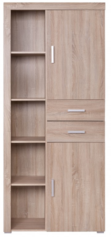 Regál je vyroben z kvalitního lamina. Regál má dvoje dvířka, dva šuplíky a otevřenou policovou část. Korpus i dvířka jsou vyrobeny v dezénu dub sonoma. Zásuvky mají plnovýsuvné kovové kuličkové pojezdy. Nábytek má plastové úchyty a nožky. Díky eleganci a funkčnosti jednotlivých dílů je vybavení obývacího pokoje nebo pracovny velmi snadnou záležitostí. Nábytek z kolekce VALLES je vyroben s hranou ABS. Je navržen tak, aby i jednotlivě vkusně doplnil výbavu pokojů. Společně pak tvoří elegantní řešení výbavy vašeho bytu. Zboží dodáváme v demontu.