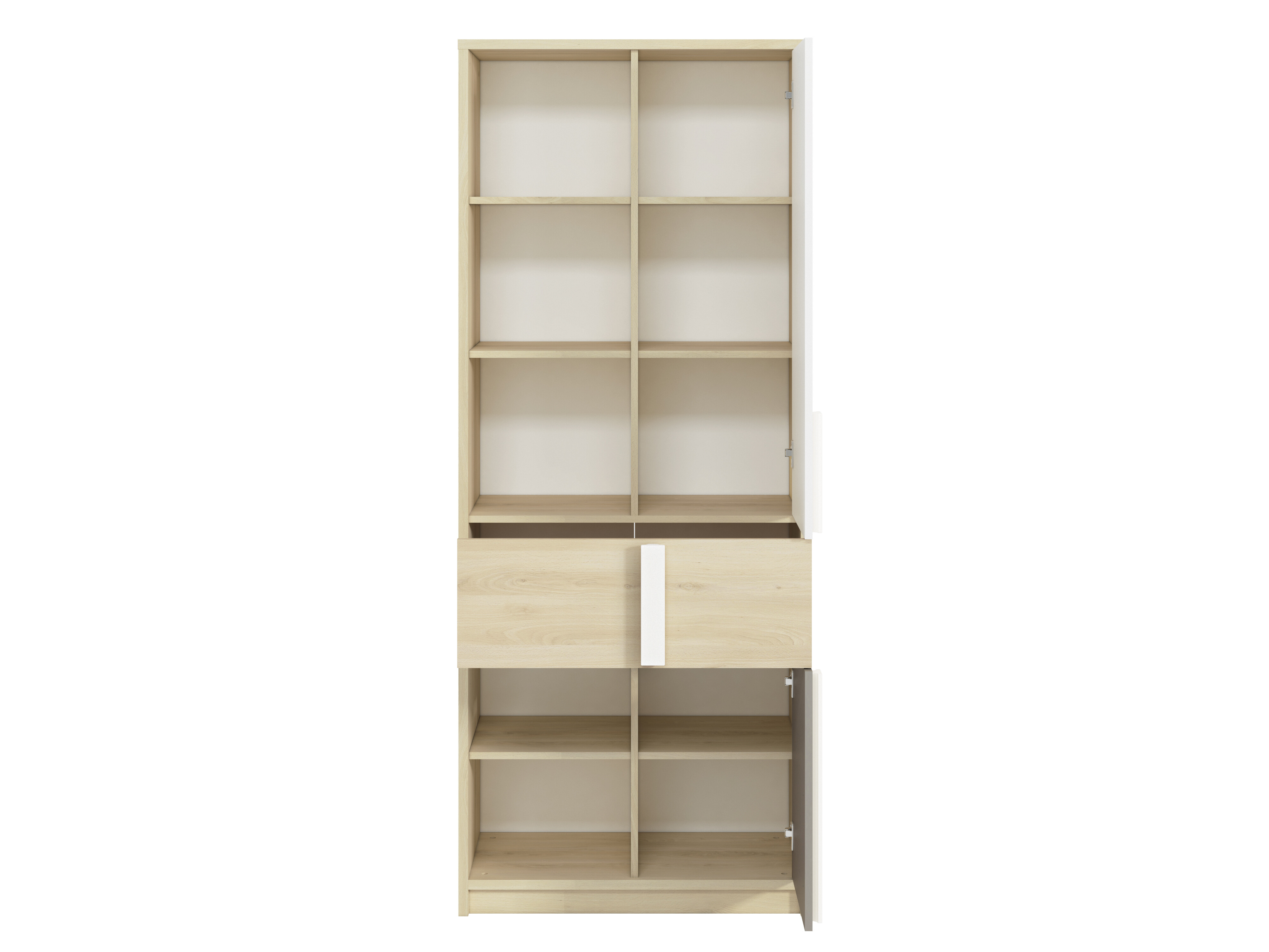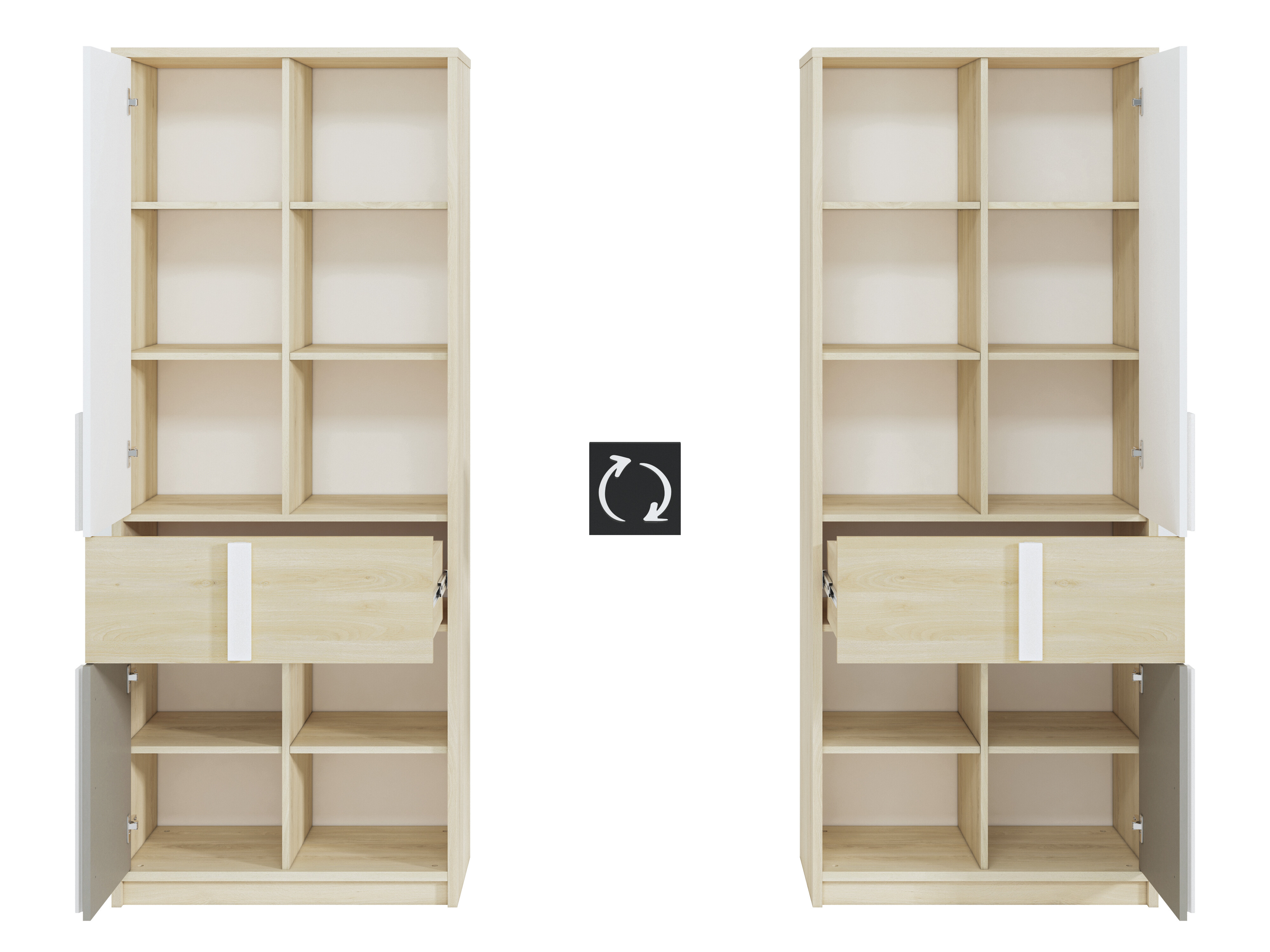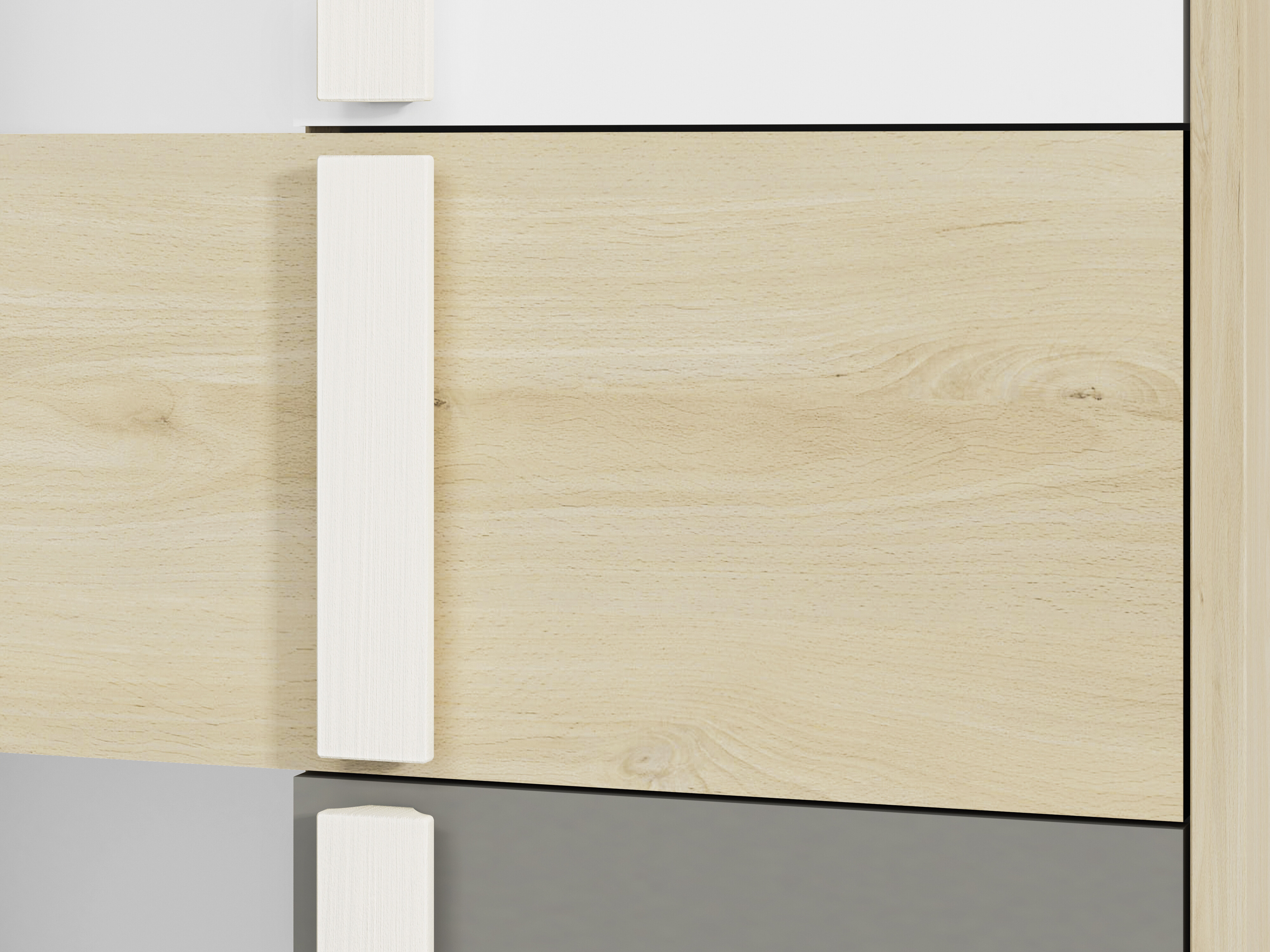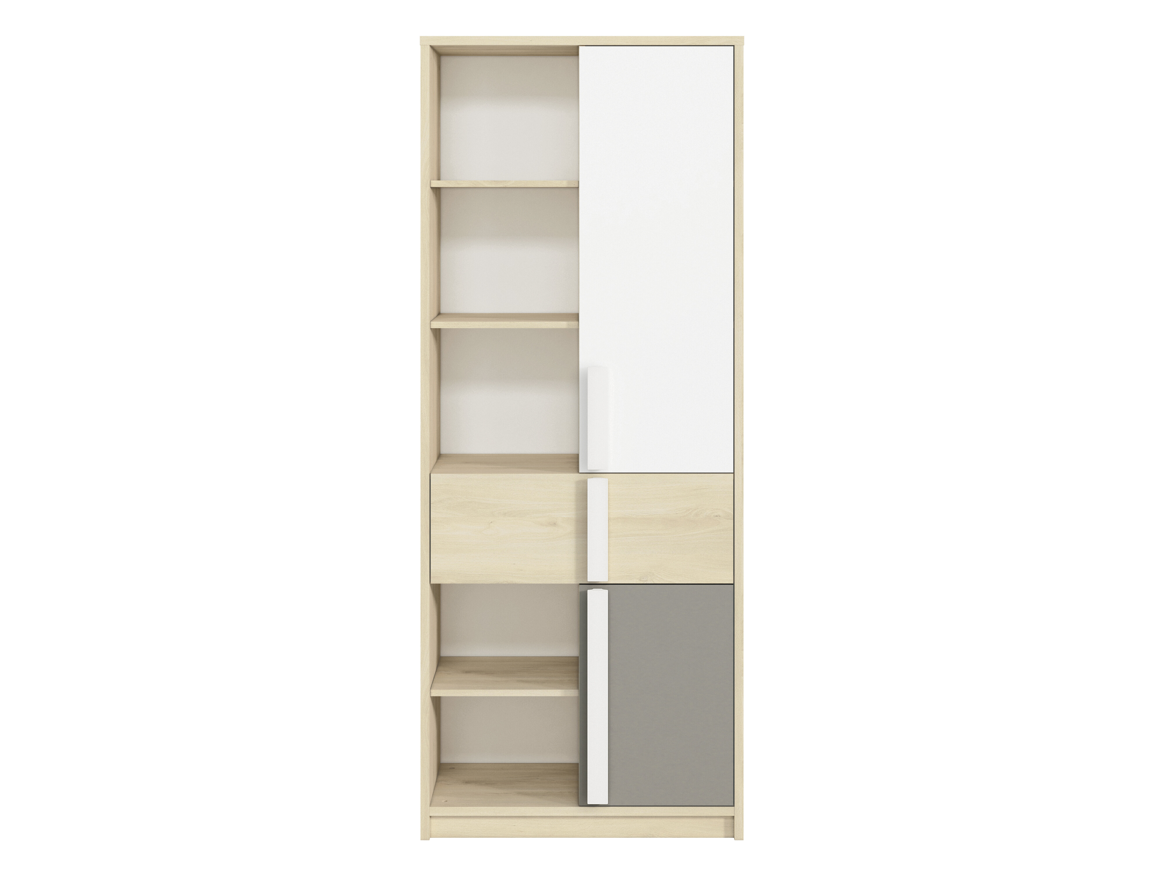 Regál Drop je vyrobena z kvalitního lamina korpus o korpusy o tl. 22mm, dvířka o tl. 16m s ABS hranami. Korpus je v provedení buk fjord a dvířka bílá/buk fjord/šedá platina. Úchyty jsou dřevěné. Zboží je dodáváno v demontu.
