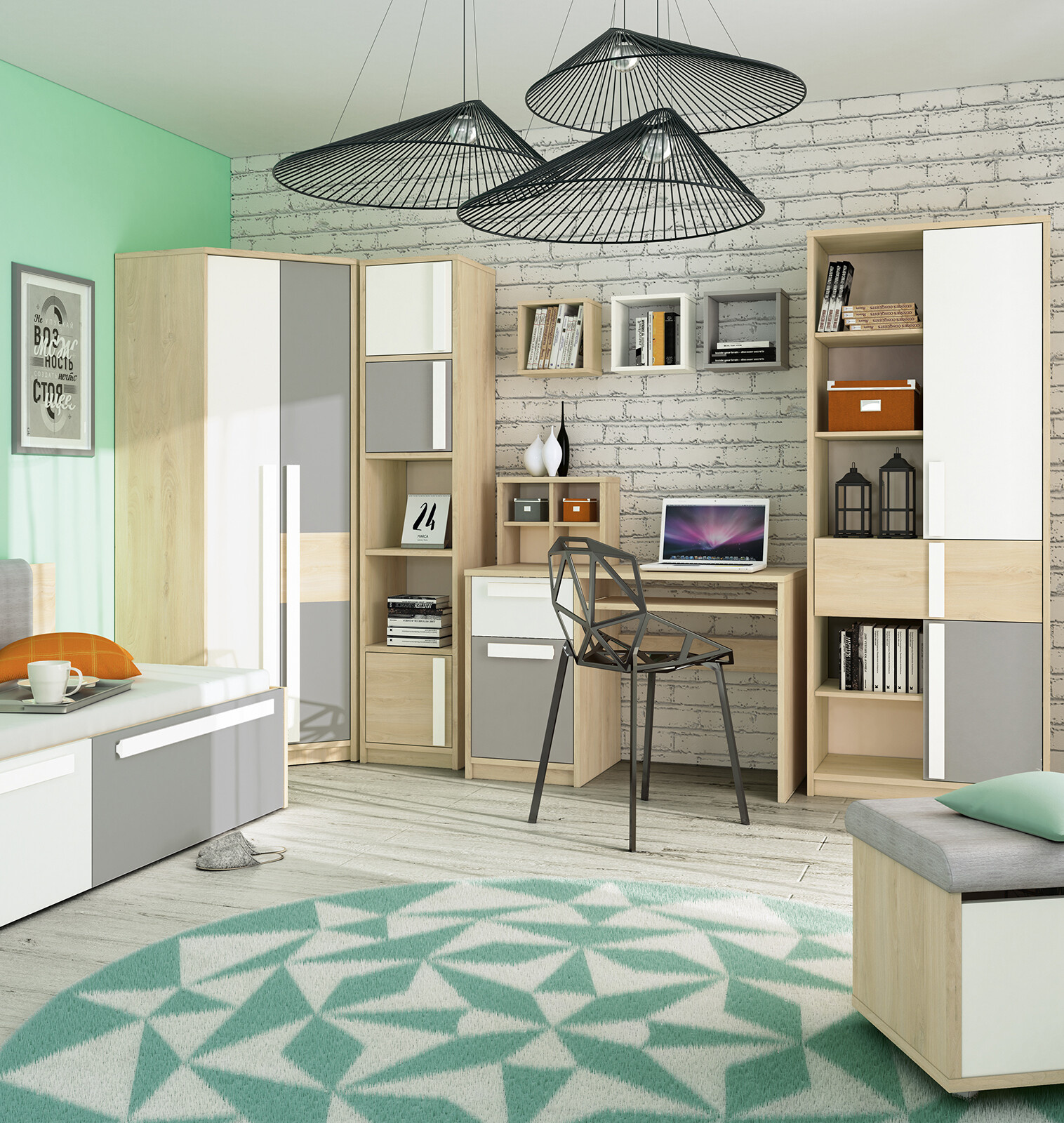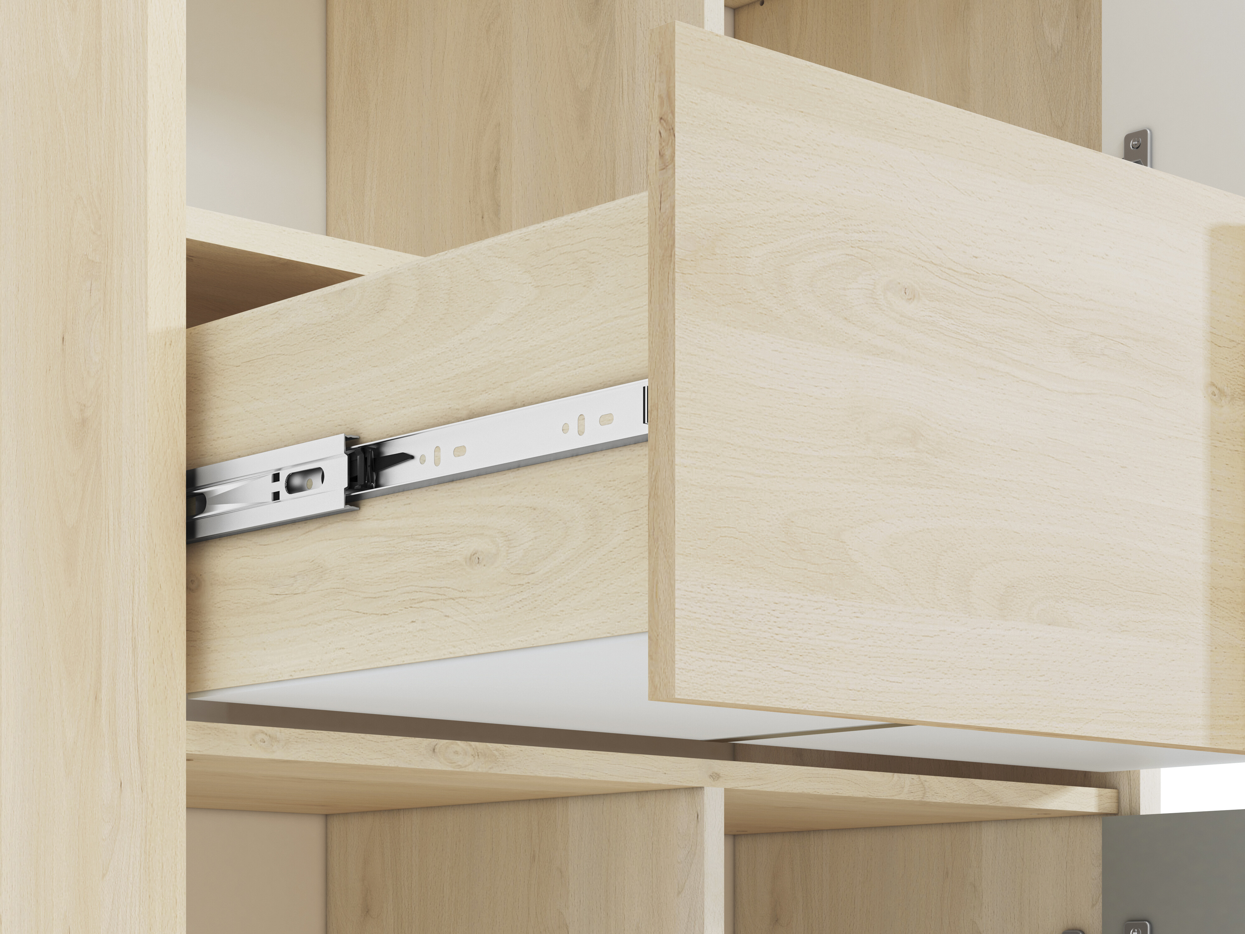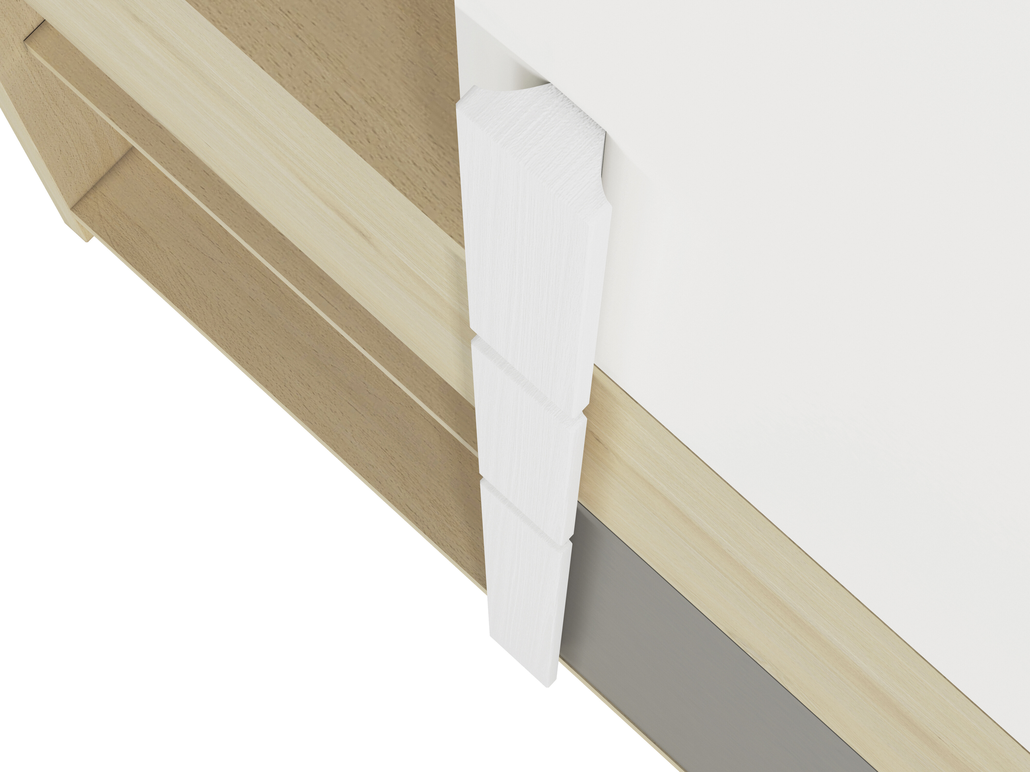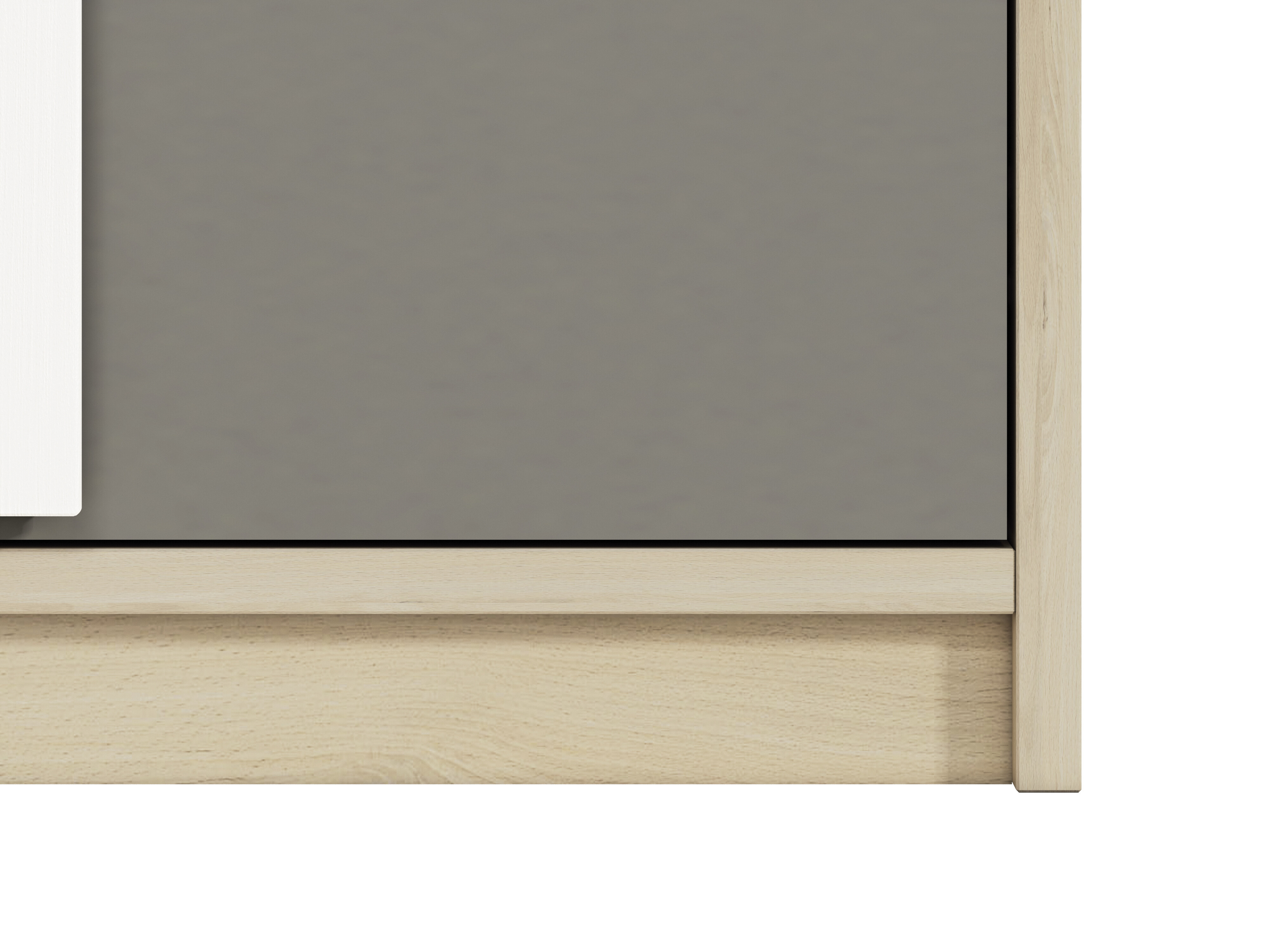 Regál Drop je vyrobena z kvalitního lamina korpus o korpusy o tl. 22mm, dvířka o tl. 16m s ABS hranami. Korpus je v provedení buk fjord a dvířka bílá/buk fjord/šedá platina. Úchyty jsou dřevěné. Zboží je dodáváno v demontu.