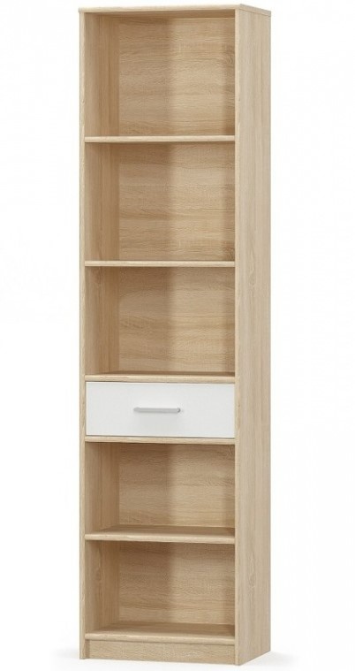 Otevřený regál Tips je vyroben z lamina o síle 16mm. Regál se zásuvkou a 5 otevřenými poličkami nabízíme v dezénu bílá/ dub sonoma. Hrany lamina chrání ABS o síle 0,5mm. Pojezdy zásuvky jsou kovové, úchytka plastová. Kombinujte dle potřeby i s dalšími prvky z kolekce Tips, kterými vybavíte nejen obývací či studentský pokoj, ale i vaši předsíň. Zboží dodáváme v demontu.