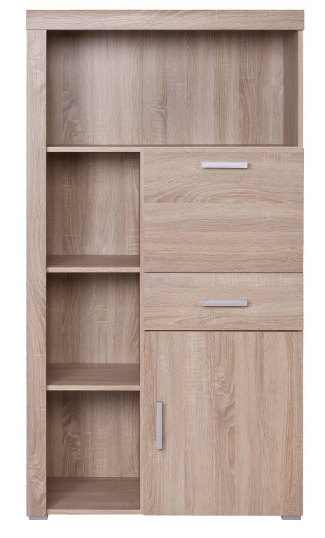 Moderní regál je vyroben z kvalitního lamina. Korpus i dvířka jsou vyrobeny v dezénu dub sonoma. Zásuvky mají plnovýsuvné kovové kuličkové pojezdy. Nábytek má plastové úchyty a nožky. Díky eleganci funkčnosti jednotlivých dílů je vybavení obývacího pokoje nebo pracovny velmi snadnou záležitostí. Nábytek z kolekce VALLES je vyroben s hranou ABS. Je navržen tak, aby jednotlivě vkusně doplnil výbavu pokojů. Společně pak tvoří elegantní řešení výbavy vašeho bytu. Zboží dodáváme v demontu.