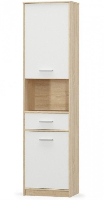 Vysoký regál Tips 2D1S je vyrobený z lamina o síle 16mm. Regál se 2 plnými dvířky, zásuvkou a otevřenou poličkou nabízíme v dezénu bílá/dub sonoma. Hrany lamina chrání ABS o síle 0,5mm. Pojezdy zásuvky jsou kovové, úchytky plastové. Kombinujte dle potřeby i s dalšími prvky z kolekce Tips, kterými vybavíte nejen obývací či studentský pokoj, ale i vaši předsíň. Zboží dodáváme v demontu.