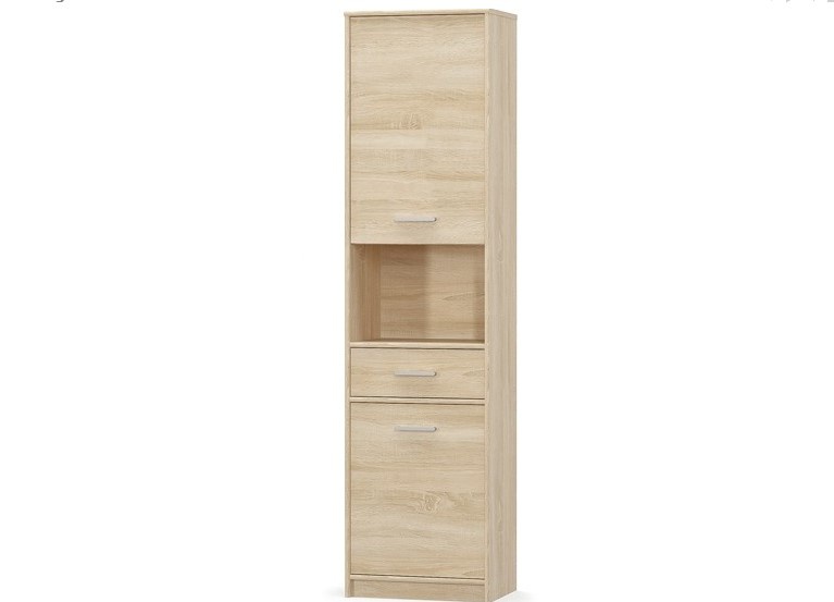 Vysoký regál Tips je vyrobený z lamina o síle 16mm. Regál se 2 plnými dvířky, zásuvkou a otevřenou poličkou nabízíme v dezénu dub sonoma. Hrany lamina chrání ABS o síle 0,5mm. Pojezdy zásuvky jsou kovové, úchytky plastové. Kombinujte dle potřeby i s dalšími prvky z kolekce Tips, kterými vybavíte obyvací či studenský pokoj, ale i vaši předsíň. Zboží dodáváme v demontu.