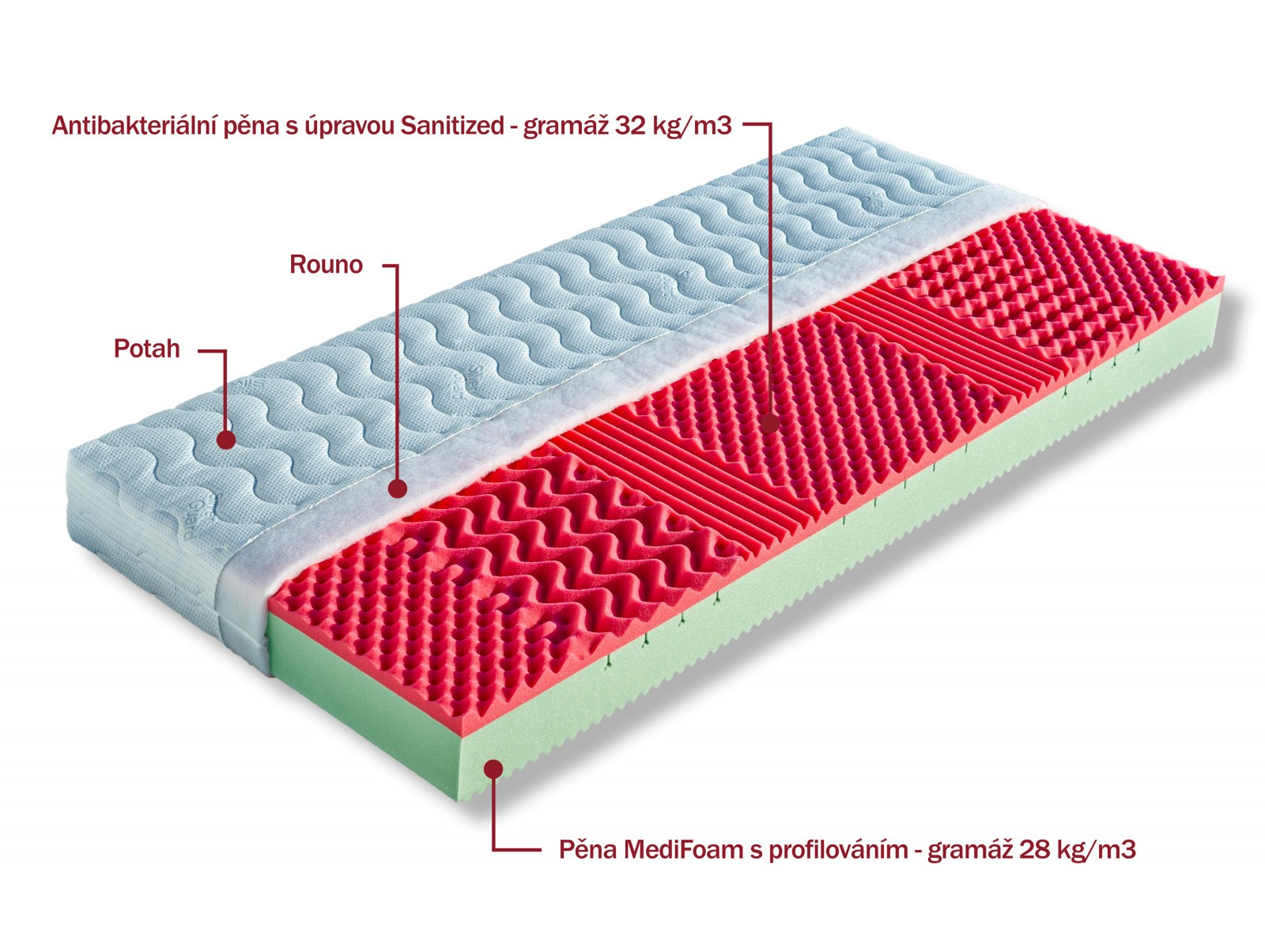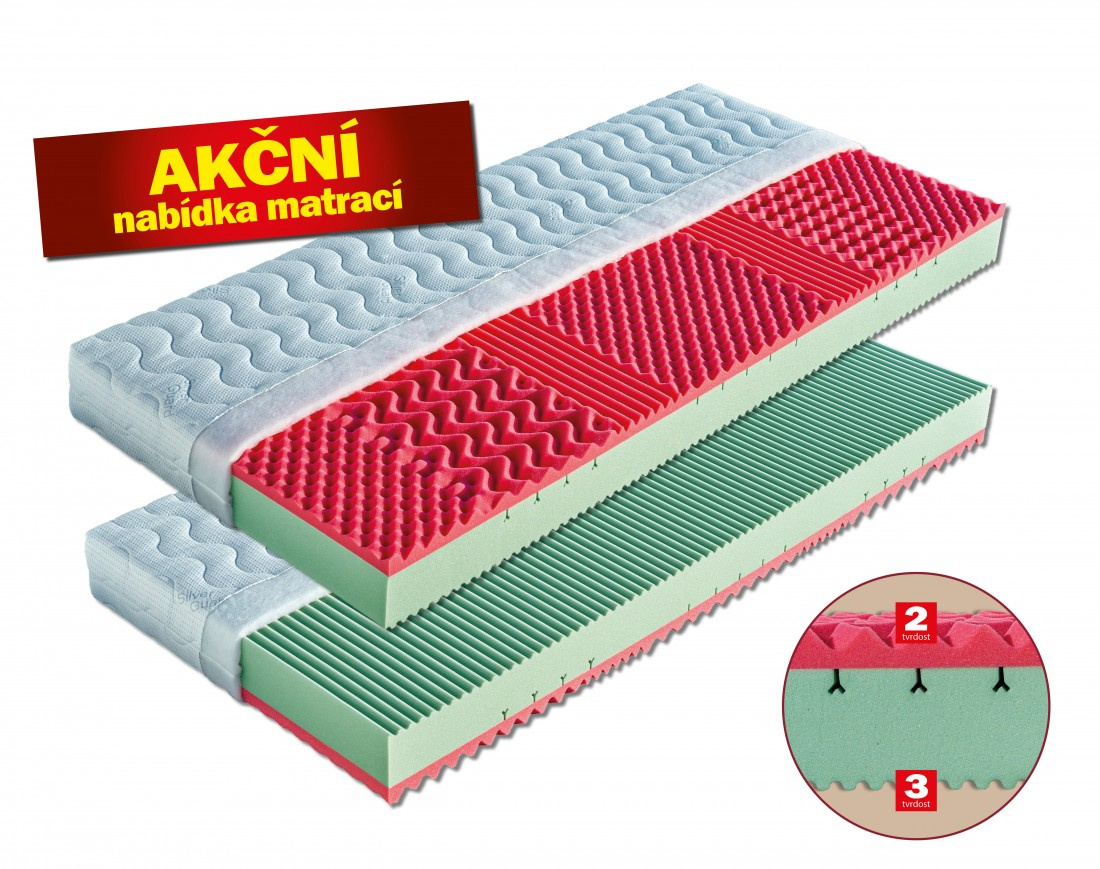 Jádro matrace tvoří vysoce gramážní a velmi elastická pěna MediFoam, která je v místech největšího zatížení změkčena speciálními zářezy ve tvaru „Y“. Jemná masážní profilace horní strany matrace přispívá k uvolnění napjatého svalstva a k provzdušnění matrace. Druhá strana je tvořena antibakteriální pěnou s úpravou Sanitized, která poskytuje trvalou a účinnou ochranu proti bakteriím, roztočům a plísním. Její tvarování do masážních nopů napomáhá provzdušnění prostoru mezi povrchem matrace a potahovou látkou. Matrace je vhodná pro alergiky. Může být položena na všechny typy roštů. Matrace lze vybrat v potahu SILVERGUARD,MEDICOTT,LYOCELL - antibakteriální potah nebo LEVANDULE - s relaxačními účinky. V objednávce prosím uveďte Vámi vybraný potah. Výška matrace včetně potahu 17 cm. Matrace do hmotnosti 120 kg.