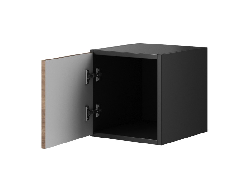 Korpus skříňky je vyroben z kvalitního lamina v barvě antracit mat, dvířka z MDF v matném provedení v barvě wotan. Možnost pověšení nebo postavení skříňky ve vertikální nebo horizontální poloze. Pokud se dvířka otevírají dolů nebo do boku, příslušné kování je přiloženo. Pokud se dvířka mají otevírat nahoru, je třeba zakoupit panty s plynovými písty (2 ks). Dvířka nemají úchytku, otevírají se systémem PUSH-CLICK. Zboží je dodáváno v demontu.