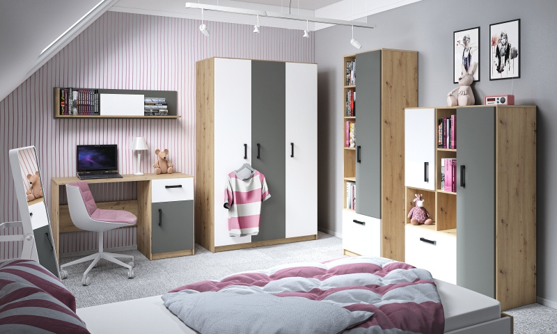 Šatní skříň FINI 13 je součástí systémového nábytku FINI ale lze ji použít i samostatně nebo k jinému nábytku. Konstrukce a přední díly jsou vyrobeny z kvalitního a odolného lamina v dekoru dřeva v kombinaci s bílou a antracitovou barvou. Úchytky jsou plastové v černé barvě.