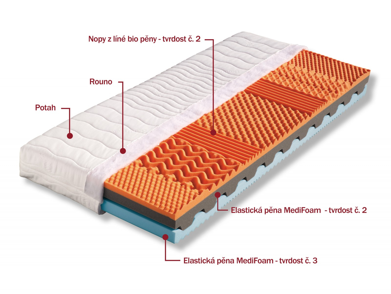 Kvalitní matrace, jejíž oranžovou nosnou vrstvu tvoří oblíbená líná bio pěna tvarovaná do masážních nopů. Bio pěna obsahuje sójový extrakt, který má příznivý vliv na lidský organizmus. Střed jádra je složen ze dvou elastických pěn MediFoam odlišných objemových hmotností a je provzdušněn příčnými průduchy, které zaručují změkčení matrace v exponovaných místech. Matrace lze vybrat v potahu SILVERGUARD,MEDICOTT,LYOCELL - antibakteriální potah nebo LEVANDULE - s relaxačními účinky. V objednávce prosím uveďte Vámi vybraný potah. Výška matrace včetně potahu 19 cm. Matrace do hmotnosti 120 kg.