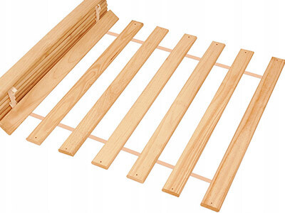 Rošt z borovicového masivu. Jednotlivé latě spojené stuhou. Předvrtané otvory pro připevnění roštu na koncích a středu.
