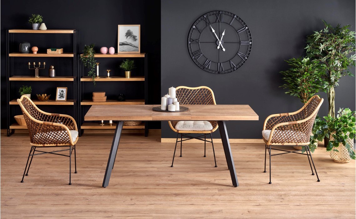 Moderní rozkládací jídelní stůl je vyroben z kvalitního MDF v dezénu ořech medový, nohy černé. Židle nejsou součástí produktu. Zboží dodáváme v demontu.