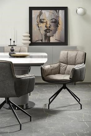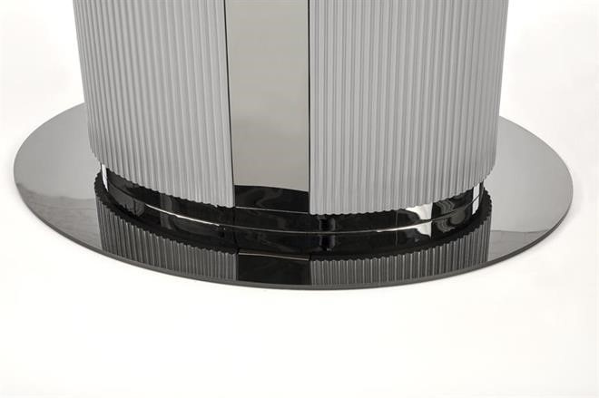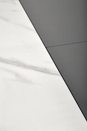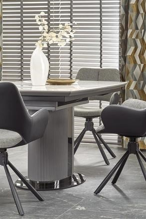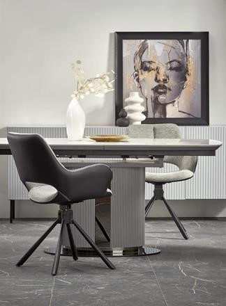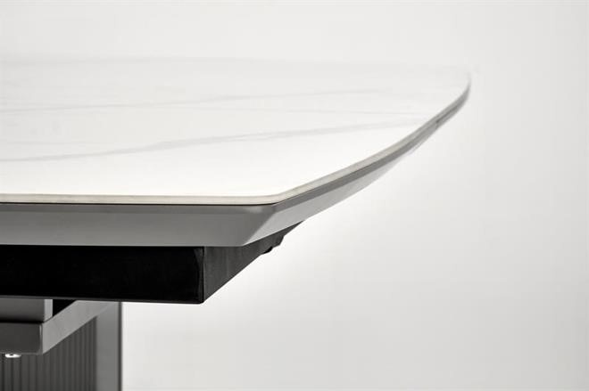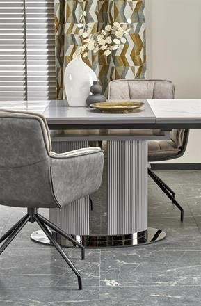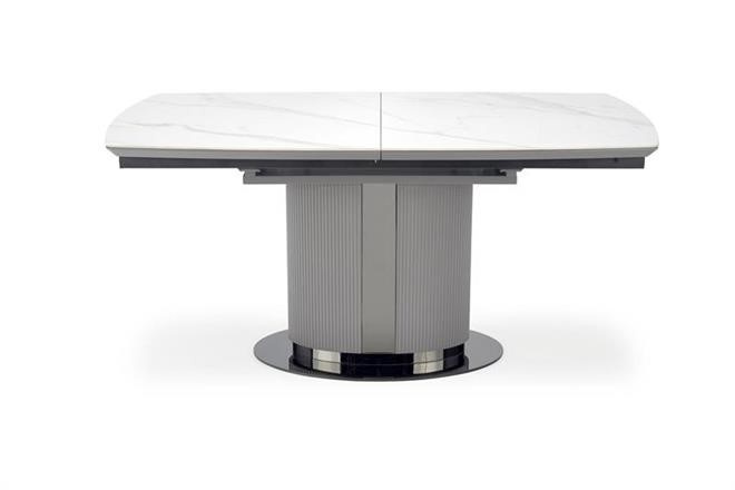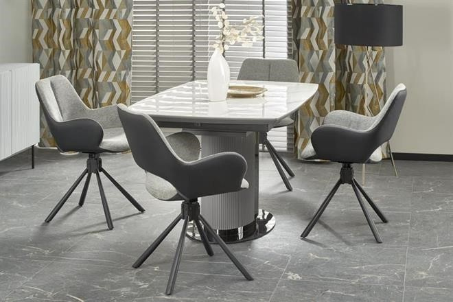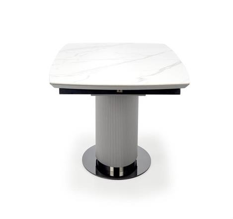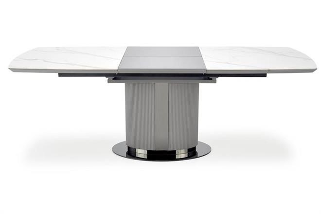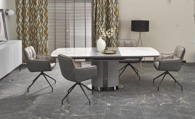 Moderní rozkládací jídelní stůl má desku vyrobenou z keramiky/MDF lakovaná v dezénu bílý mramor/šedá, nohu z práškované malované oceli v barevném provedení sv. šedá/černá. Židle nejsou součástí produktu. Zboží dodáváme v demontu.