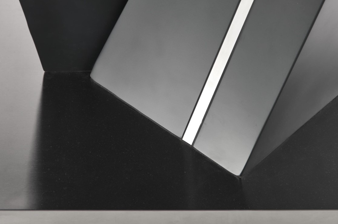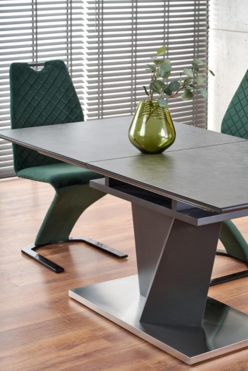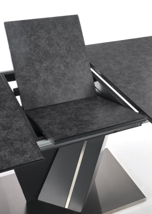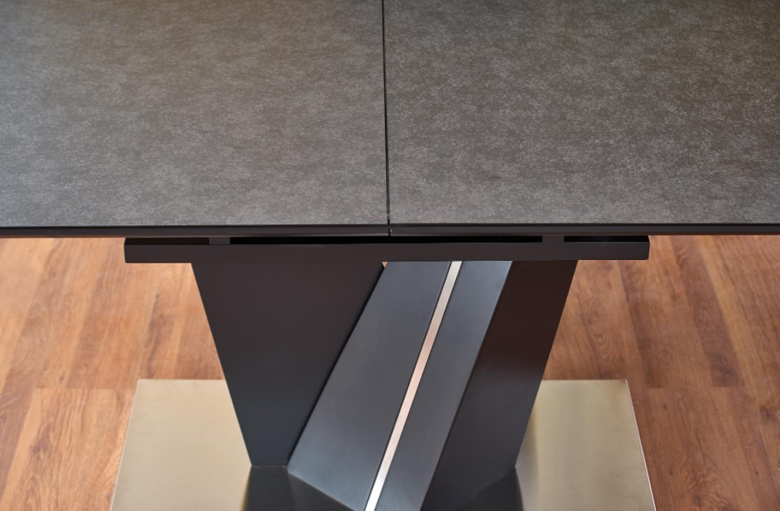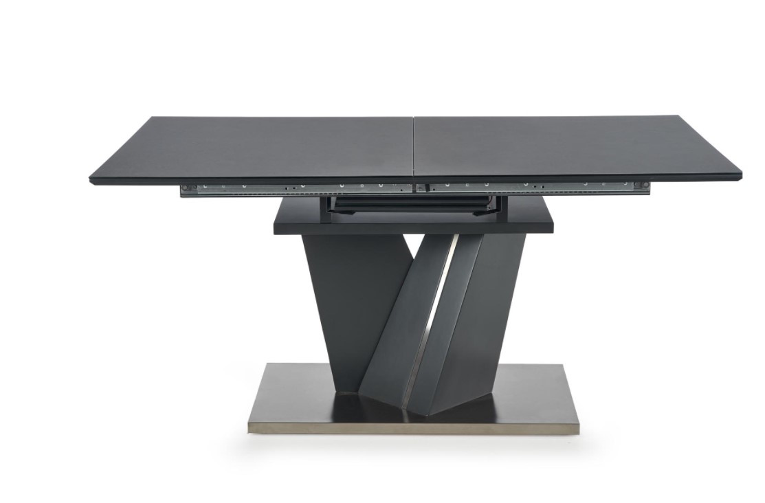 Elegantní rozkládací jídelní stůl. Deska jídelního stolu v obdélníkovém tvaru je v kombinaci provedení MDF lakované a skla v barvě tmavě šedé. Horní desku je možno rozložit až do 200 cm. Atypická noha je tmavě šedá ocel nerezová. Zboží dodáváme v demontu.