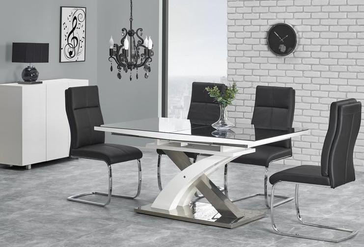 Jídelní stůl rozkládací Sandor 2 je svým vzhledem velmi moderní a elegantní. Je vyroben v kombinaci tvrzeného skla - černé s MDF lamino lak v barvě bílá, nohy jsou z chromované ocele. Tento jídelní stůl Sandor 2 je vhodný do domácností, ale i do různých restaurací či kaváren. Židle nejsou součástí jídelního stolu. Zboží je dodáváno v demontu.
