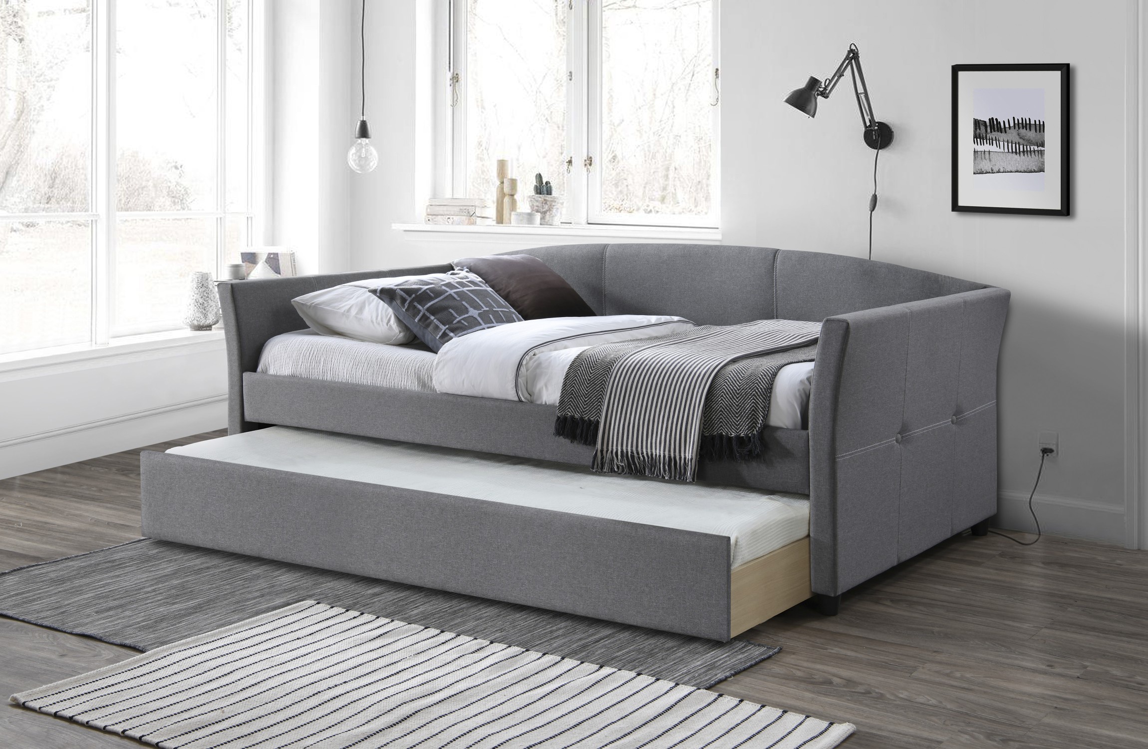 Čalouněná postel s výsuvnou spodní postelí je vyrobena z materiálu látka/masivní dřevo. Potahová látka je v barvě šedá. Zboží dodáváno bez matrací.