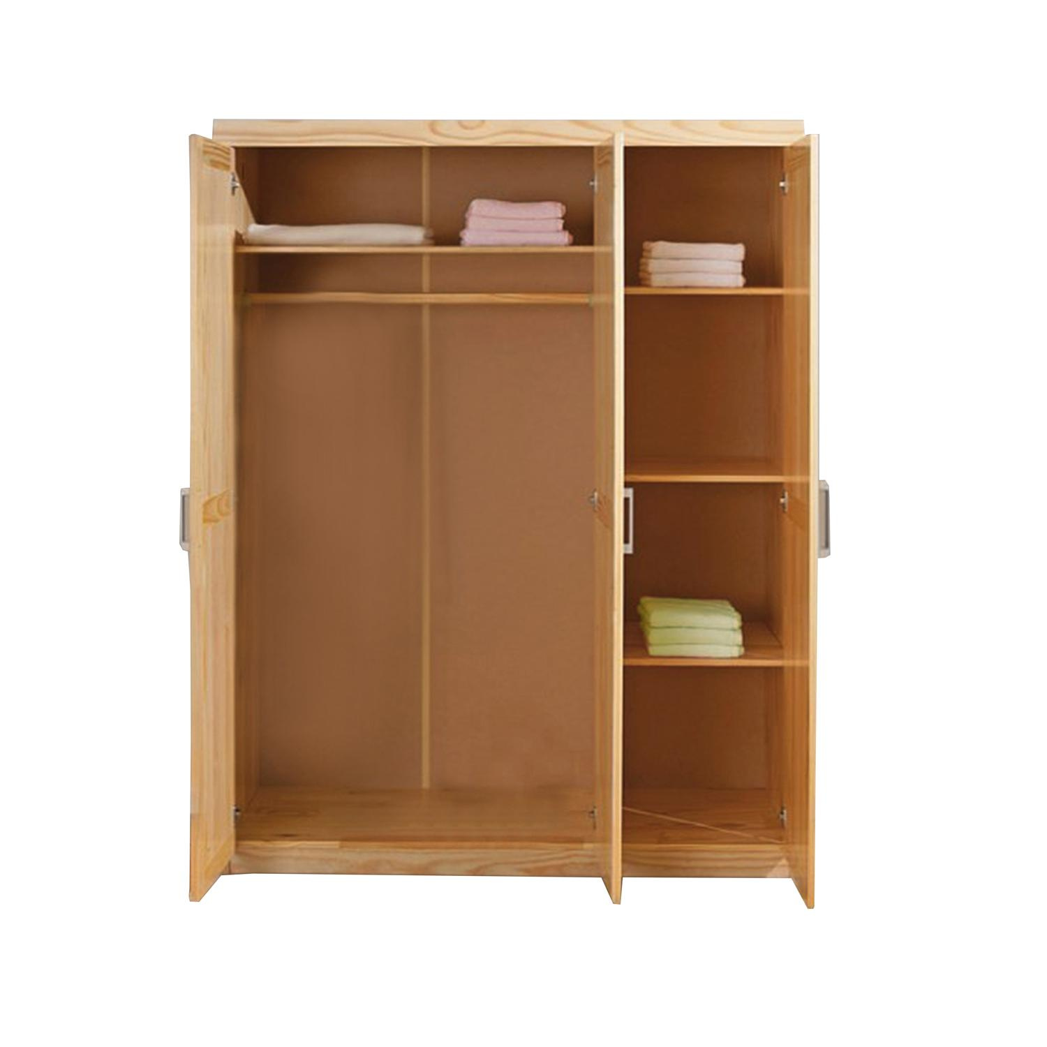 Skříň 8883 v provedení masiv borovice lakovaná je dělena v poměru 2:1. Přehledně tak rozdělíte oblečení vhodné k zavěšení v širší části a oblečení, které poskládáte do tří variabilních polic, které naleznete v užší části skříně. V širší části skříně se kromě pevné šatní tyče nachází i police vhodná na nejrůznější doplňky. Pevná skříň bude v pokoji zařízeném masivním nábytkem vždy spolehlivě sloužit. Zboží je dodáváno v demontu.