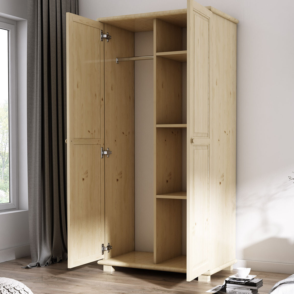 Šatní skříň z masivu borovice. Uvnitř skříně se nachází na jedné polovině tyč a na druhé police. Možnost výběru z variant. Zboží dodávám v demontu.