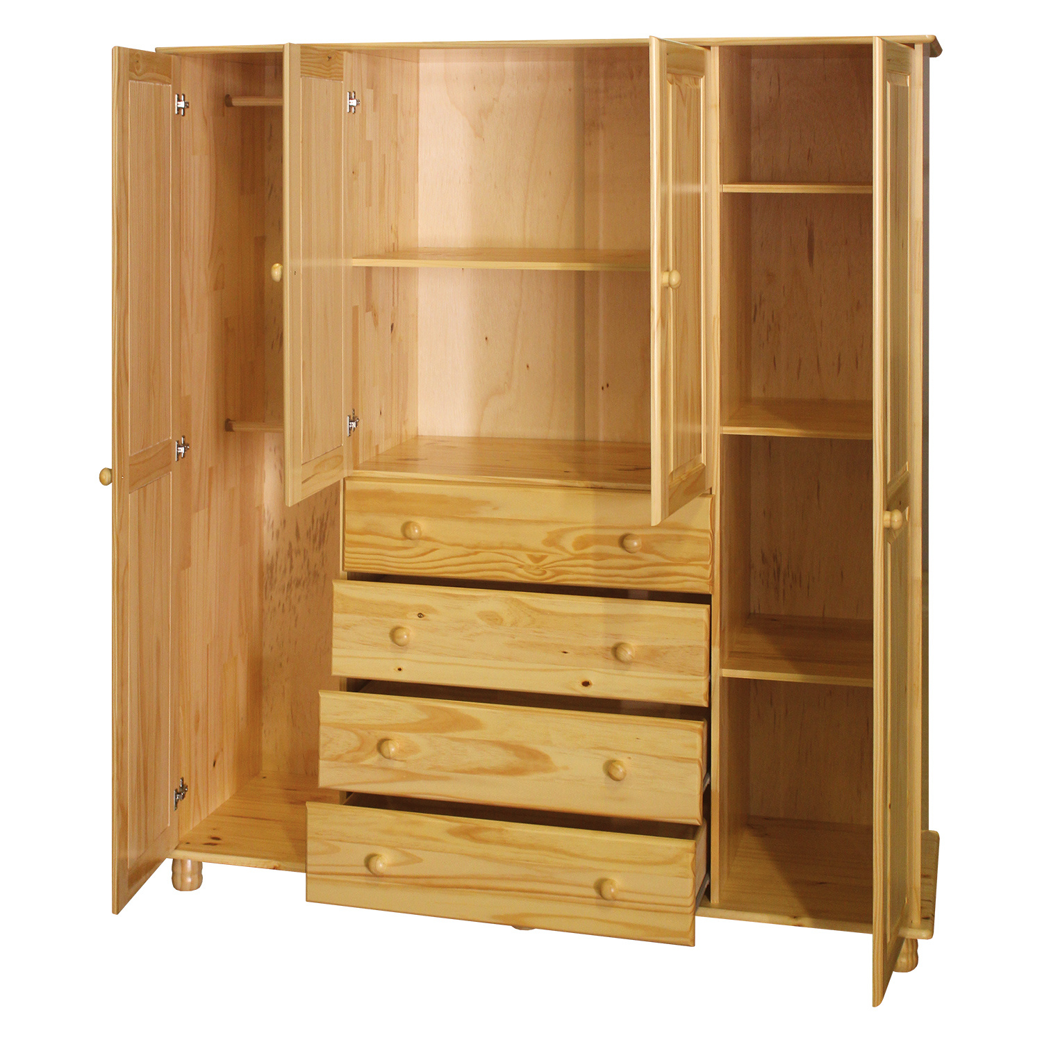 Lakovaná čtyřdvéřová skříň v provedení masiv borovice bude ozdobou každého pokoje. Robustní skříň je prakticky rozdělena do několika části. Pravá a levá část skříně disponuje otočnými dveřmi, za kterými najdete police a šatní tyč. Ve střední části se nachází menší otočné dveře a čtyři praktické zásuvky s kovovými pojezdy. Do skříně tak přehledně uložíte veškerou garderobu. Na velké skříni dokonale vynikne kresba dřeva. Nábytek v přírodním lakovaném odstínu si vás získá. Doporučený nástavec 8853. Zboží dodáváme v demontu.