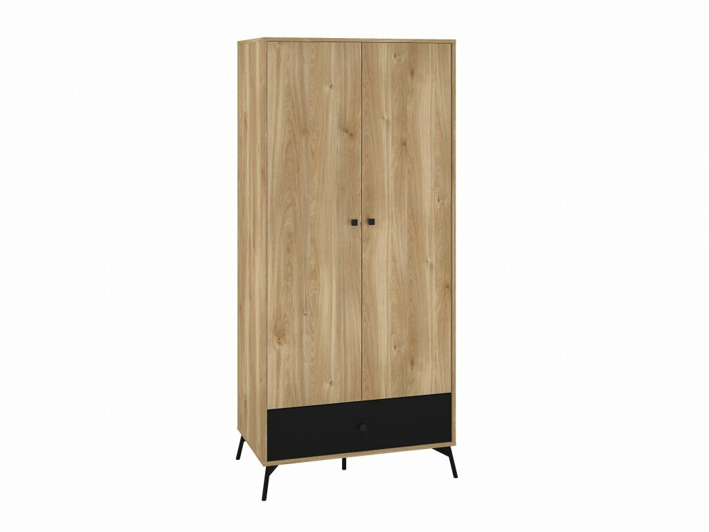 Šatní skříň Agis je vyrobena z kvalitního lamina v dezénu korpus dub castello a dvířka  dub castello/ černá. Plastová úchytka čtvrcová černé barvy. Vysoké kovové nohy černé barvy. Zboží dodáváme v demontu.