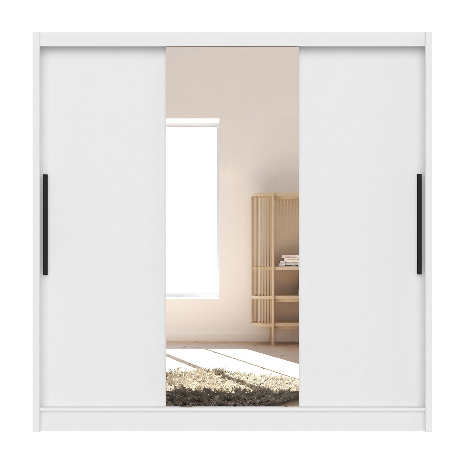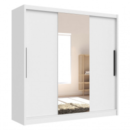 Šatní skříň z lamina v barevném provedení bílá. Skříň má 3 posuvné dveře s platovými úchyty. Na středních dveřích zrcadlo o tloušťce 3 mm. V levé části skříně 4 police, šířka police 61 cm, ve střední a pravé části 2 šatní tyče, každá v délce 68 cm nad tím široká police, šířka police 138 cm. Zboží dodáváme v demontu.