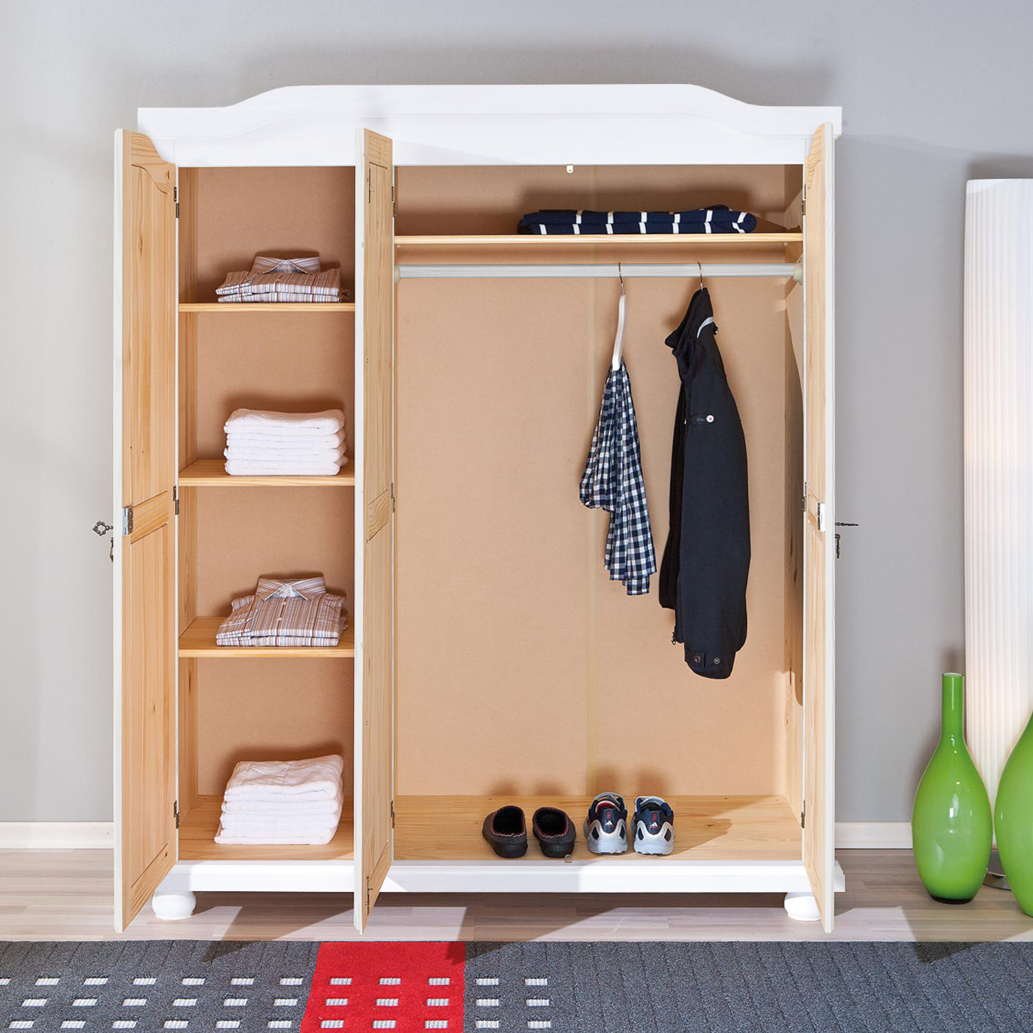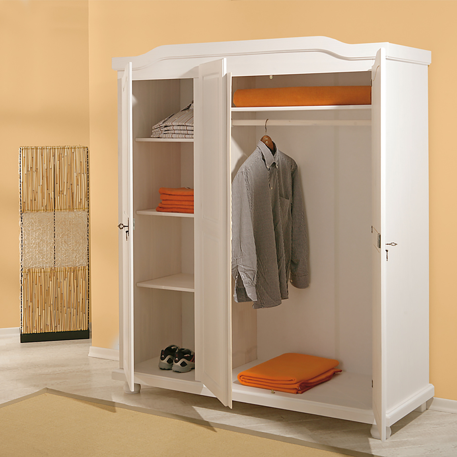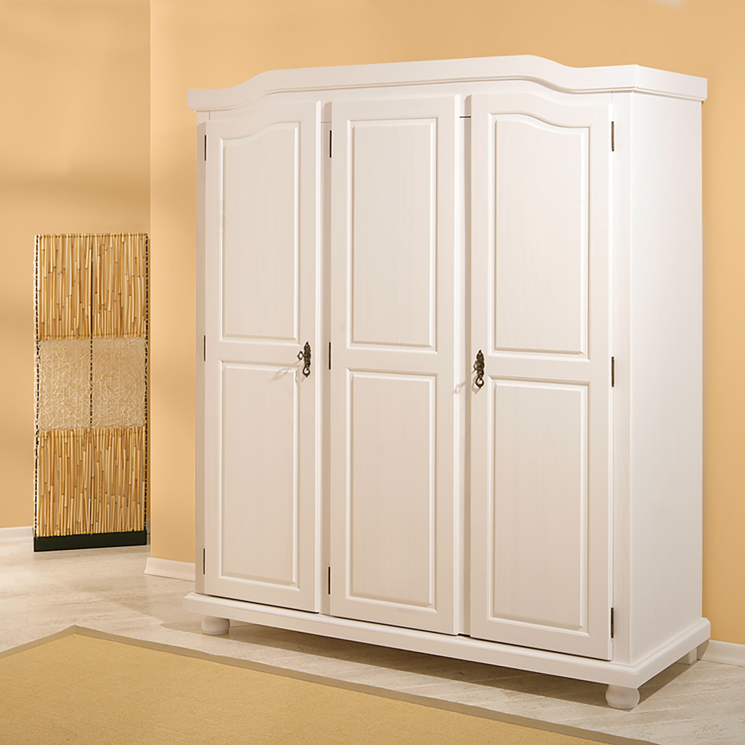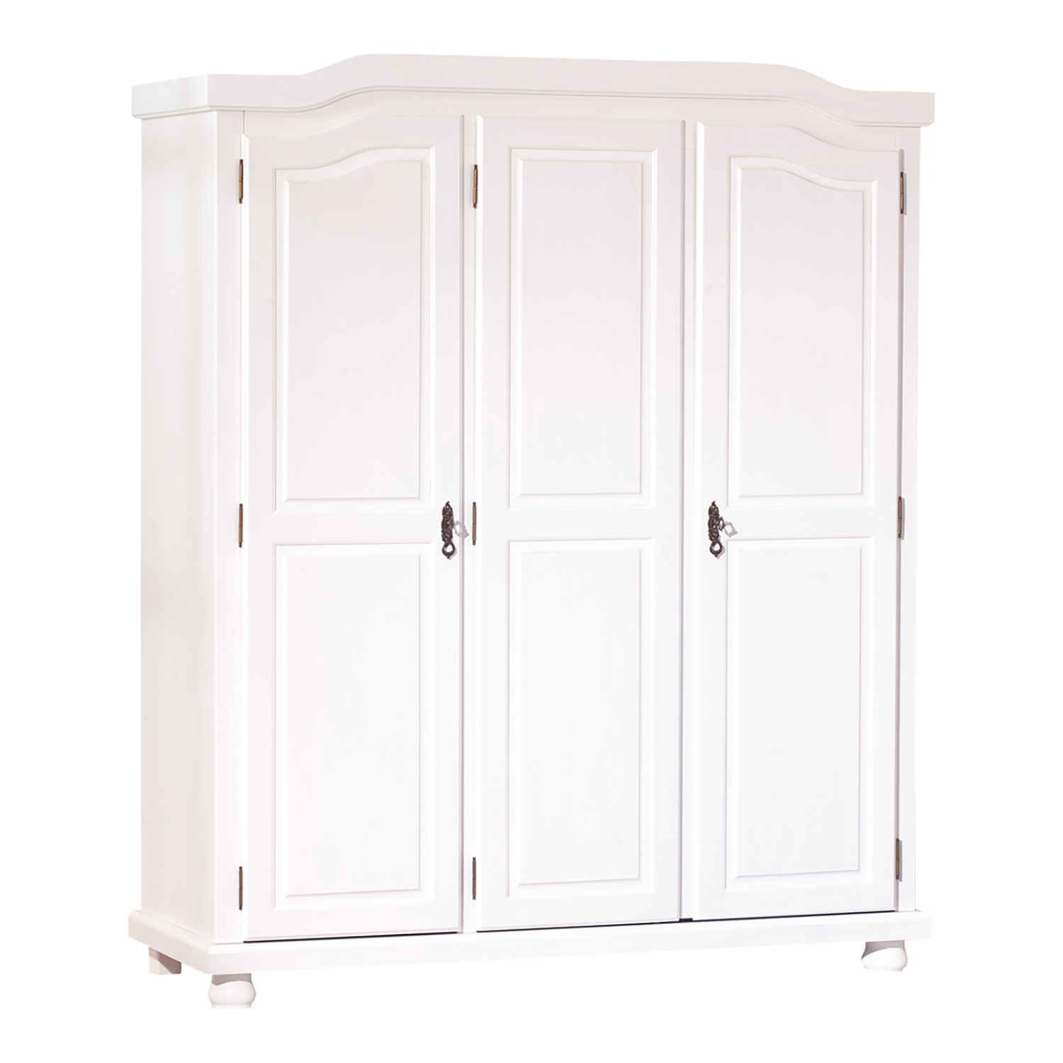 Bílá skříň v provedení masiv borovice je dělena v poměru 2:1, širší část je vybavena šatní tyčí a širokou policí, užší část pak třemi policemi. Do skříně tak zavěsíte všechny vaše svršky a poskládáte nejrůznější kousky oblečení. Design skříně v oblíbeném rustikálním stylu dá vaší místnosti nádech romantiky. Krásně tvarovaná bílá skříň je zdobena kovovými detaily, které ještě umocňují její unikátní vzhled. Skříň lze uzamknout za pomoci ozdobných kovových klíčů. Zboží je dodáváno v demontu.