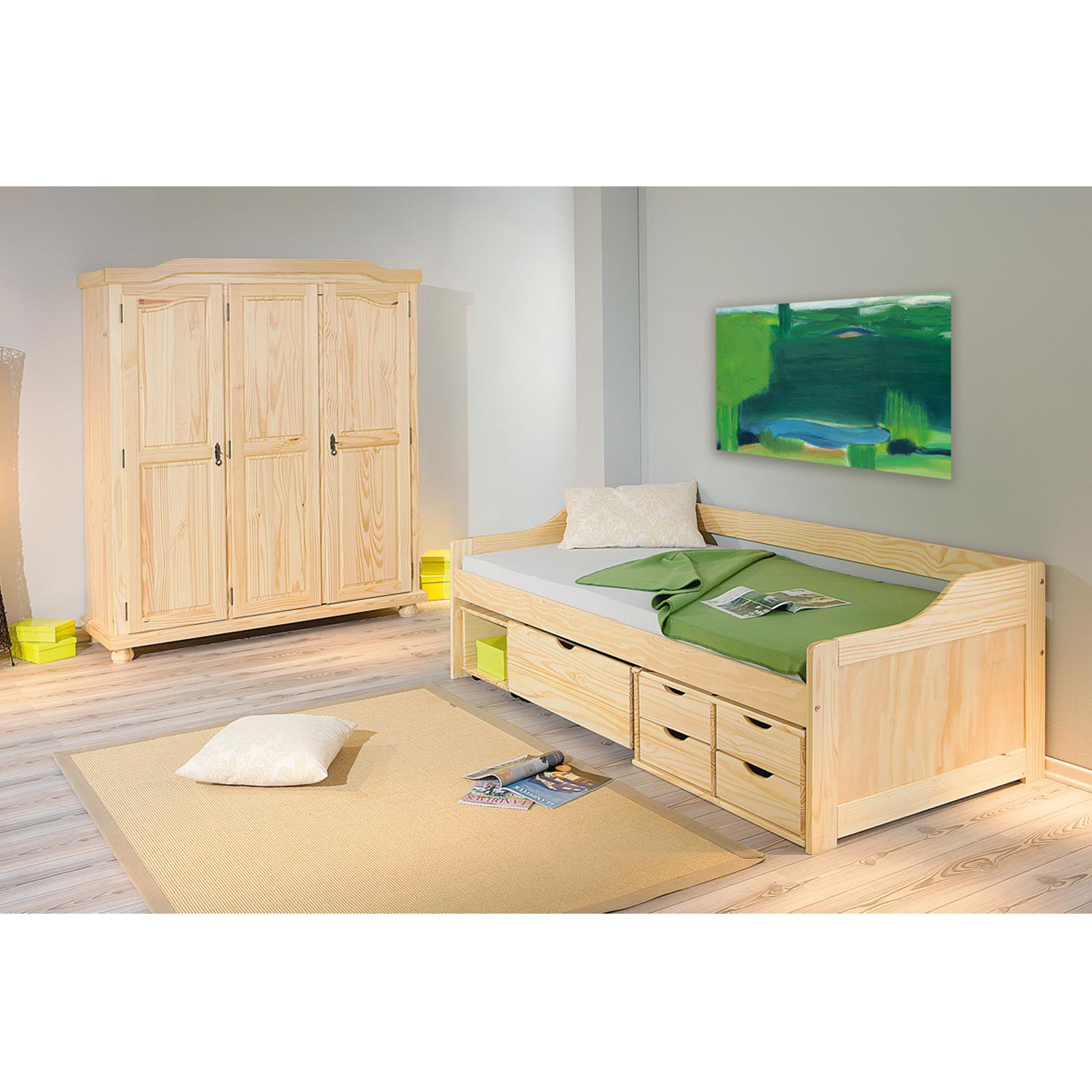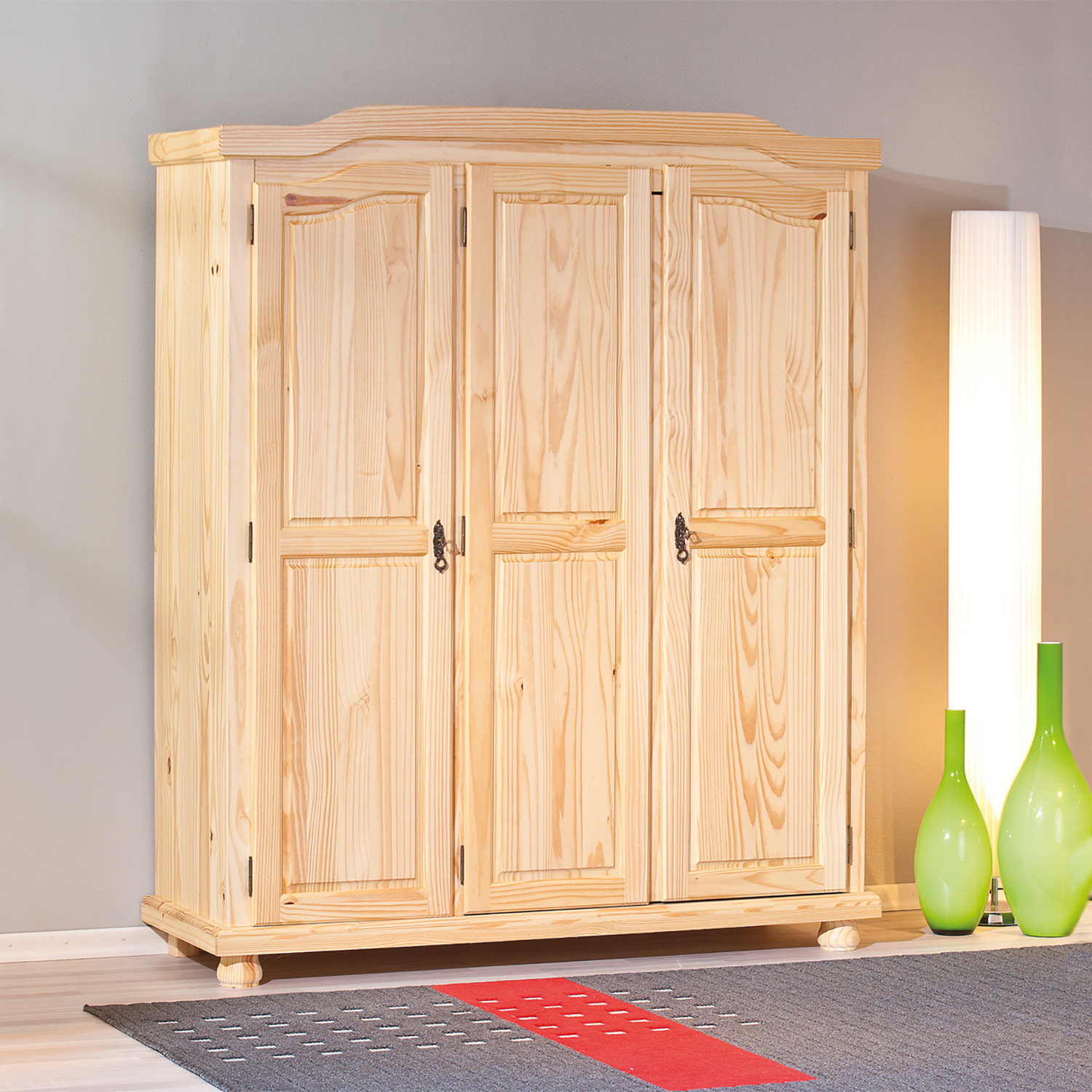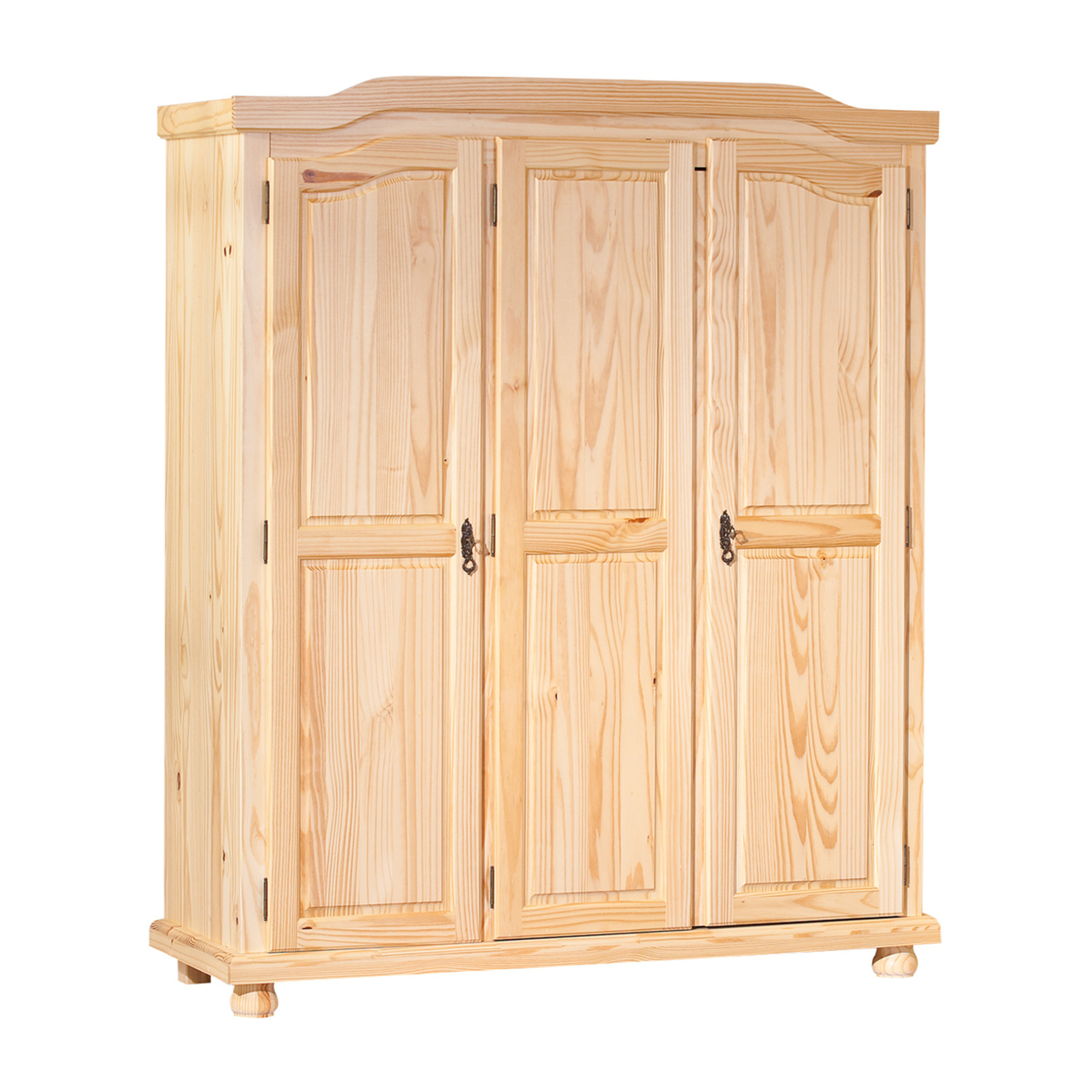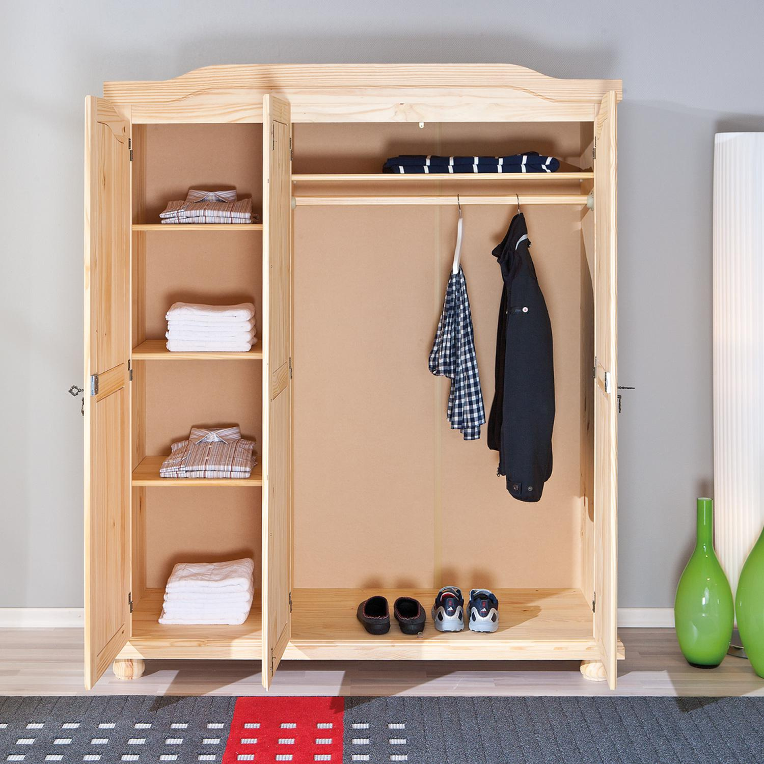 Šatní skříň BERN v provedení masiv borovice má prostor dělený v poměru 2:1. Širší část skříně obsahuje šatní tyč a polici, užší část pak tři variabilní police. Velká skříň má zajímavý design a dveře uzamykatelné za pomoci kovových ozdobných klíčků. Masivní nábytek je nejen kvalitní, ale na tomto kousku, díky lakování, krásně vynikne i kouzelná malba dřeva. Pokoj vybavený světlým dřevěným nábytkem bude vždy působit velice příjemně. Zboží je dodáváno v demontu.
