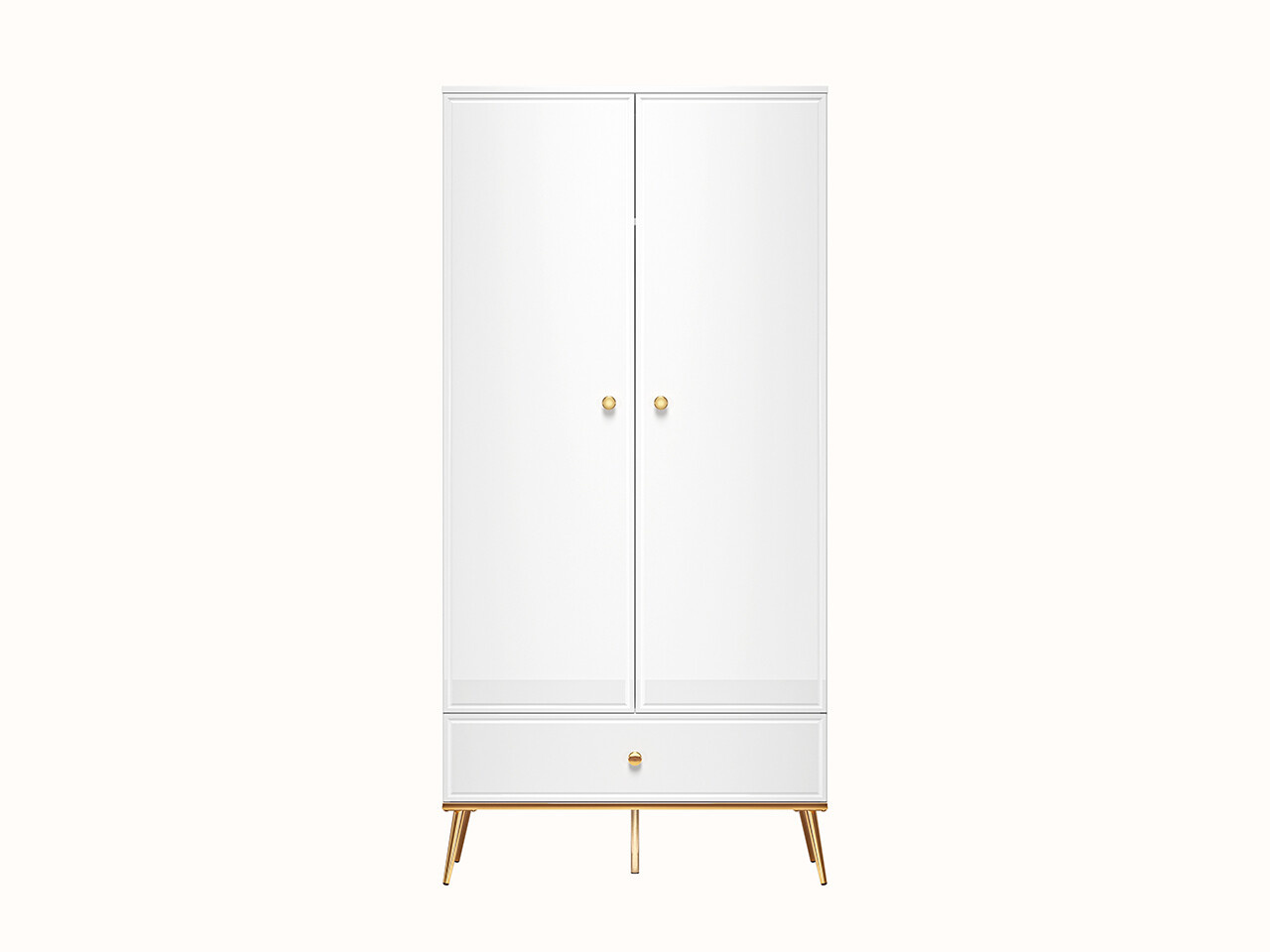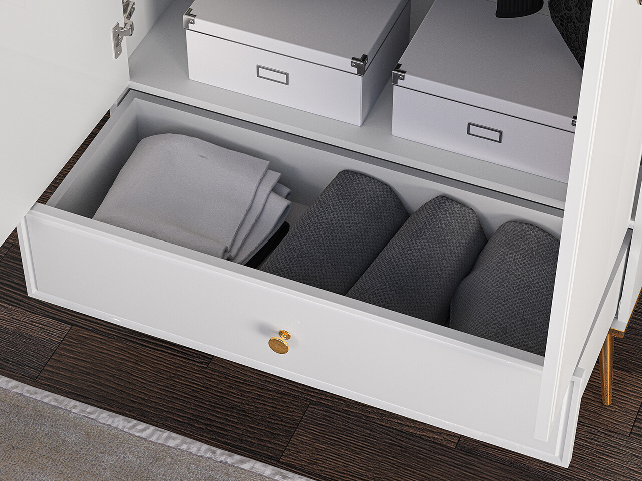 Šatní skříň Goldin je vyrobena z vysoce kvalitní laminované dřevotřískové desky s ABS hranou korpus v  dezénu bílá/ bílá lesk. Úchytky a nožka jsou kovové v zlaté barvě. Skříňky i zásuvky jsou vybaveny systémem tichého zavírání, který zajistí plynulé a nehlučné zavírání dvířek. Aby byla kvalita produktů Goldin ještě více zvýrazněna, výrobce je vybavil osvětlením, které je v sadě. Zboží dodáváme v demontu.