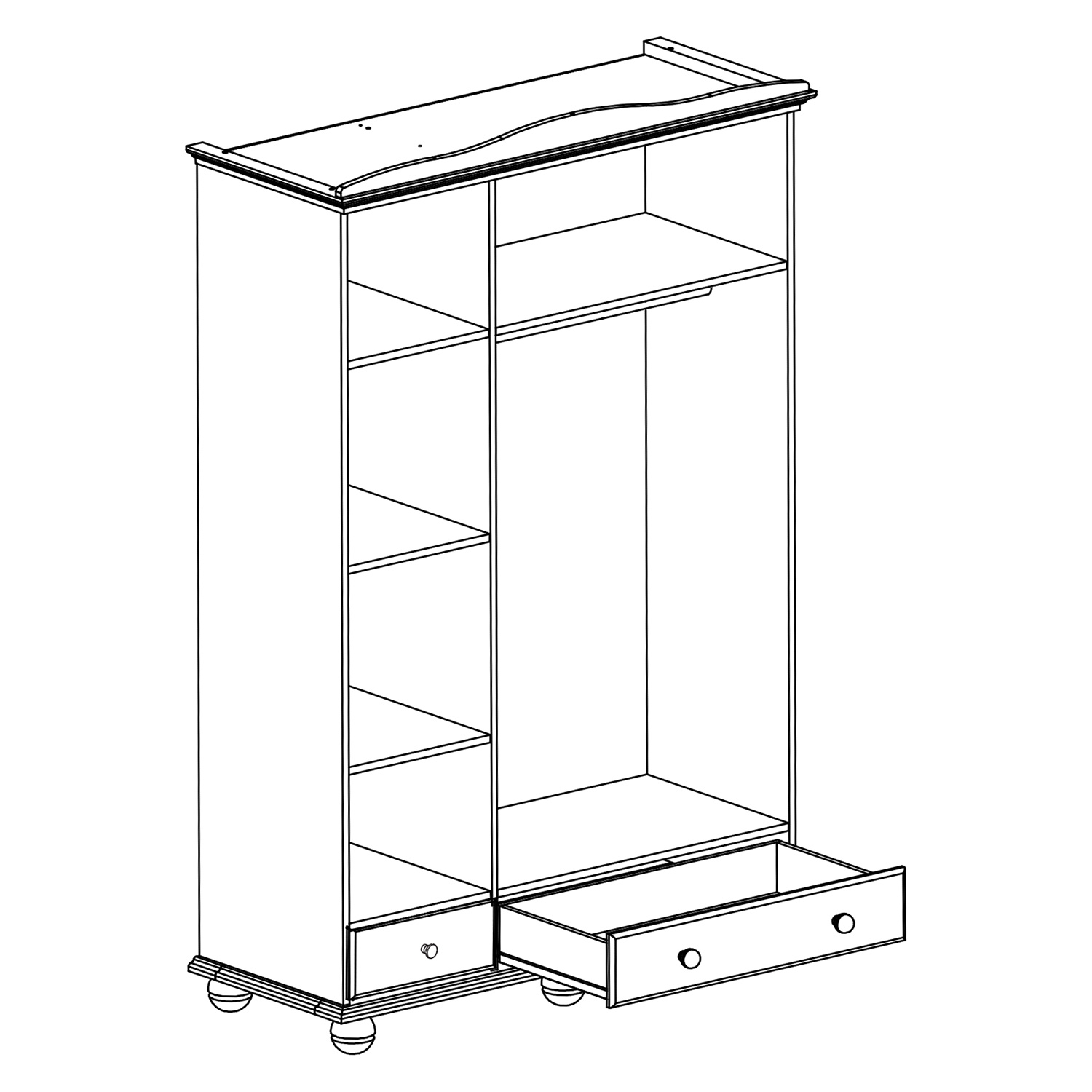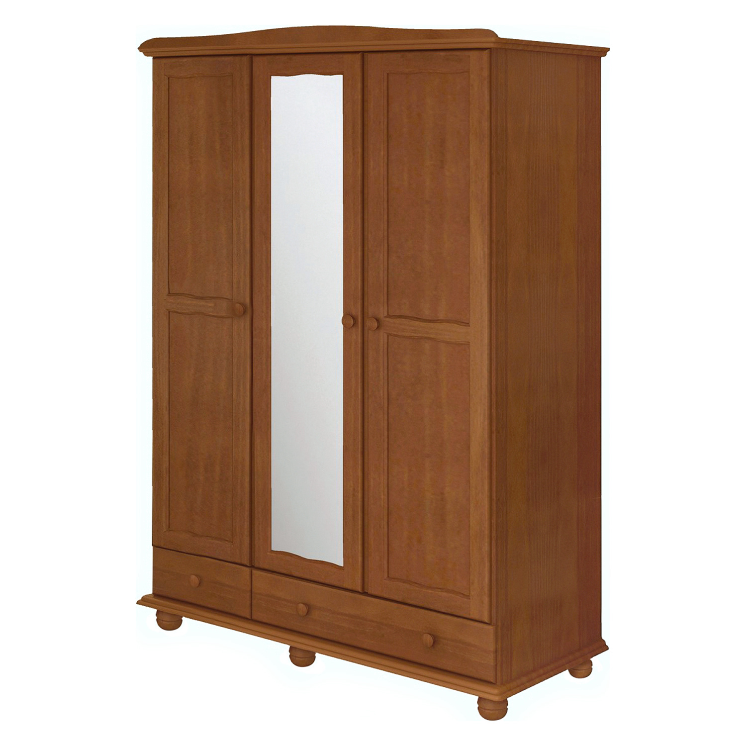 Šatní skříň z materiálu masiv borovice v barevném provedení hnědý lak. Prostor skříně je dělený 1:2, v levé užší části 3 police, v pravé šírší části šatní tyč a police. V dolní části 2 zásuvky s kovovými pojezdy. Na středních dveřích zrcadlo. Zboží dodáváme v demontu.