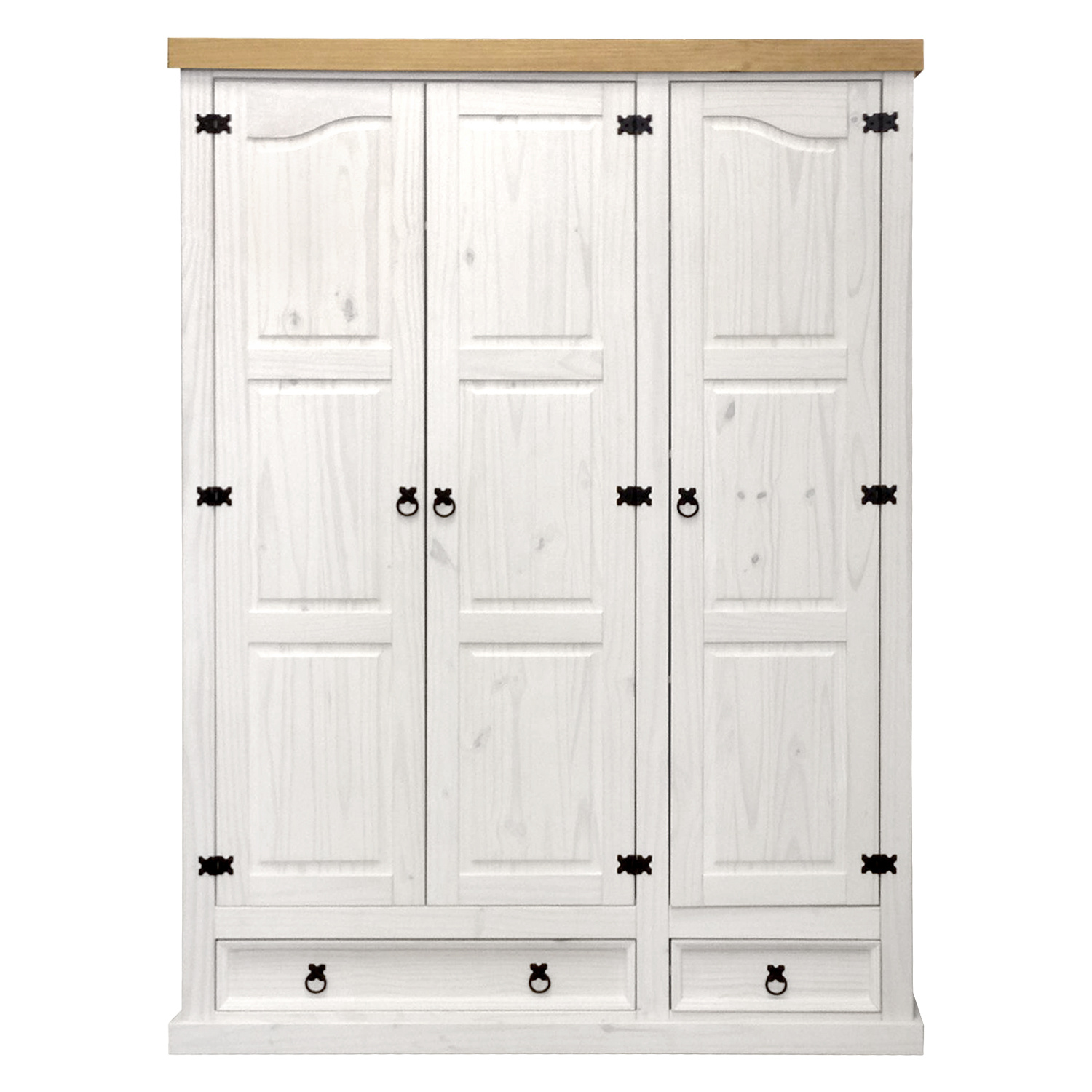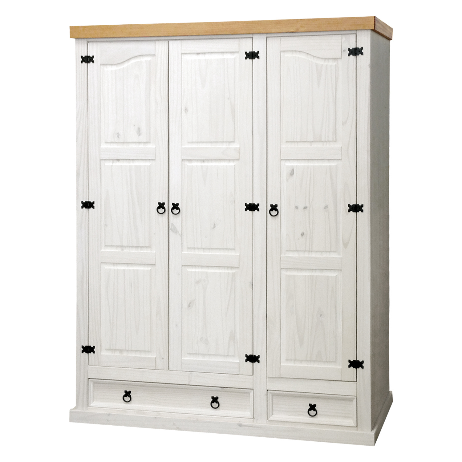 Skříň CORONA voskovaná v bílém odstínu, s horní deskou voskovanou v medovém odstínu, má šikovně dělený prostor v poměru 2:1. V širší části se nachází šatní tyč a police na doplňky, v užší části naleznete tři pevné police k poskládání oblečení. Široká a úzká zásuvka ve spodní části skříně poslouží k uložení prádla. Bílá skříň je zdobena černými úchytkami a výraznými panty, stejně jako ostatní kousky z úžasné sestavy Corona bílá. Zboží je dodáváno v demontu.