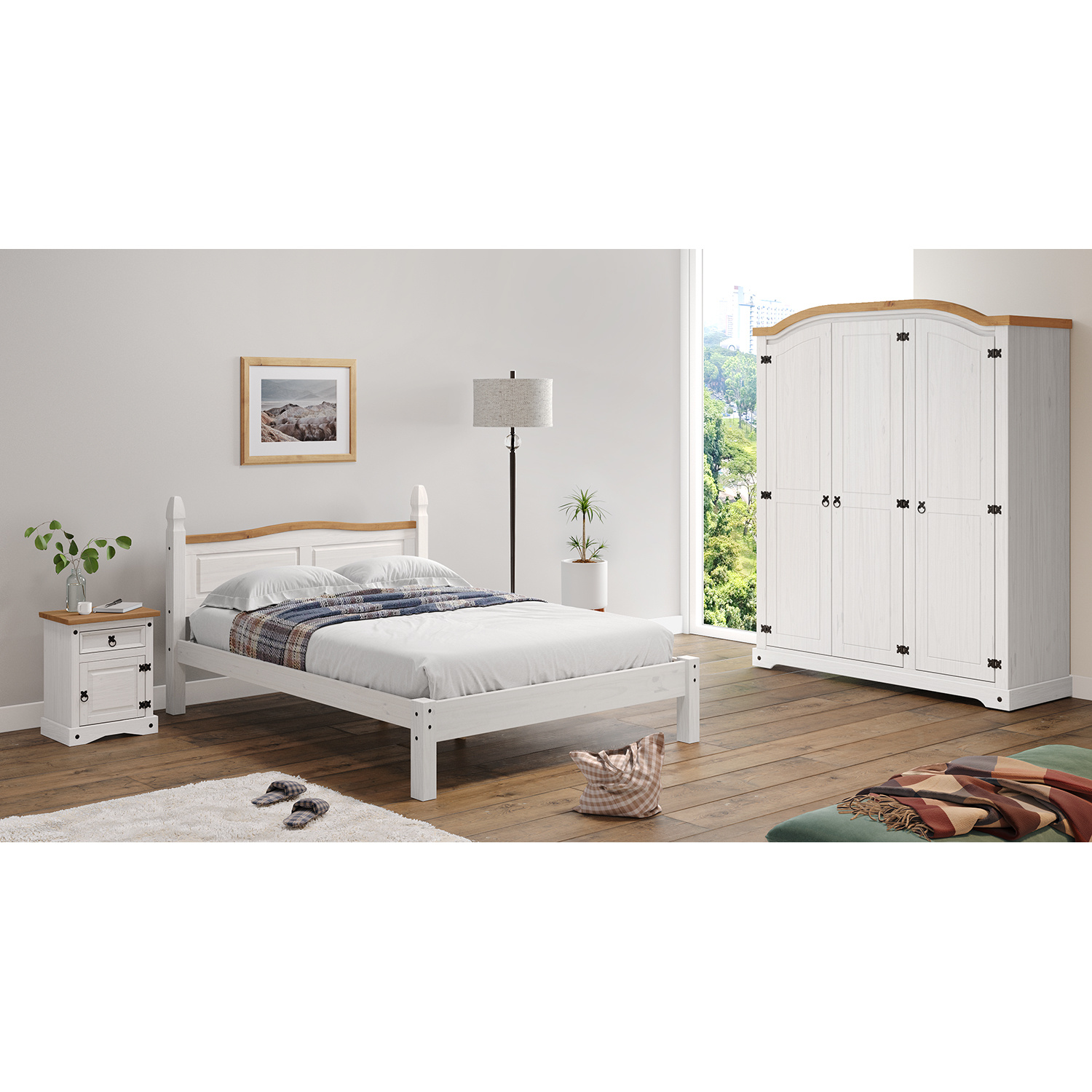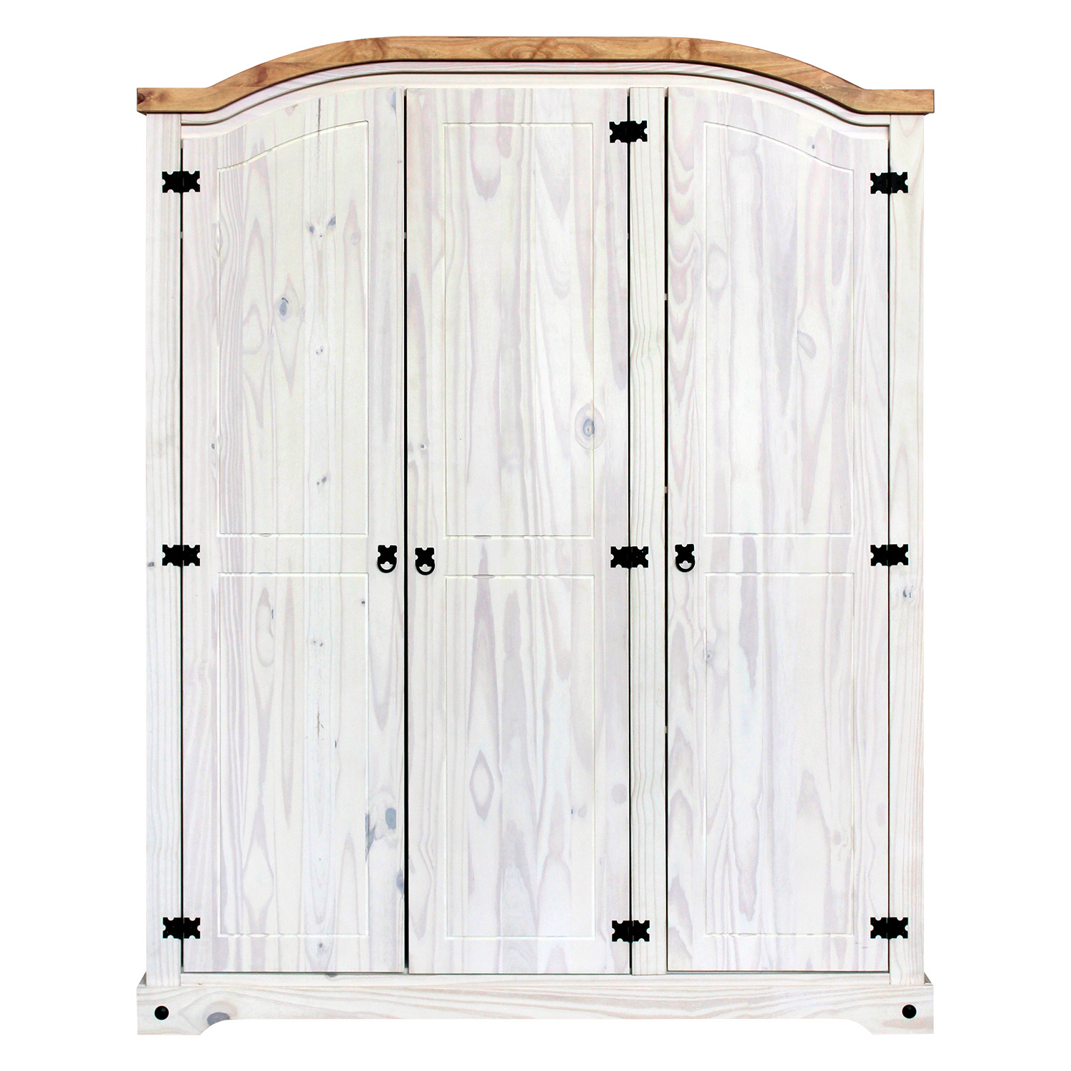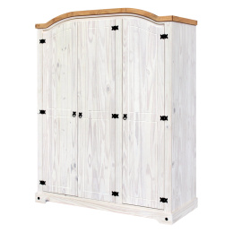 Šatní skříň je vyrobena z materiálu masiv borovice voskovaná v barevném provedení bílá. Horní deska skříně je v medovém odstínu. Prostor skříně je dělený v poměru 2:1. V širší části skříně se nachází šatní tyč a police na klobouky, v užší části najdeme 3 police z toho 2 variabilní. Skříň má kovové ozdobné úchytky . Zboží dodáváme v demontu.