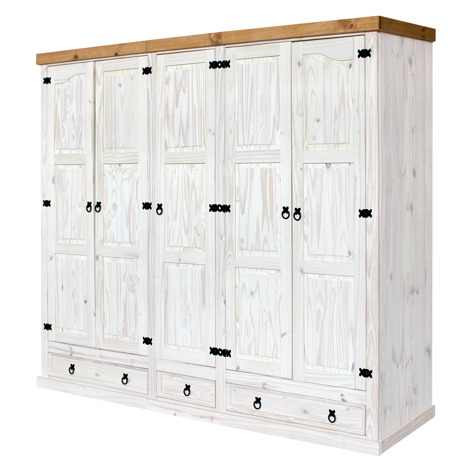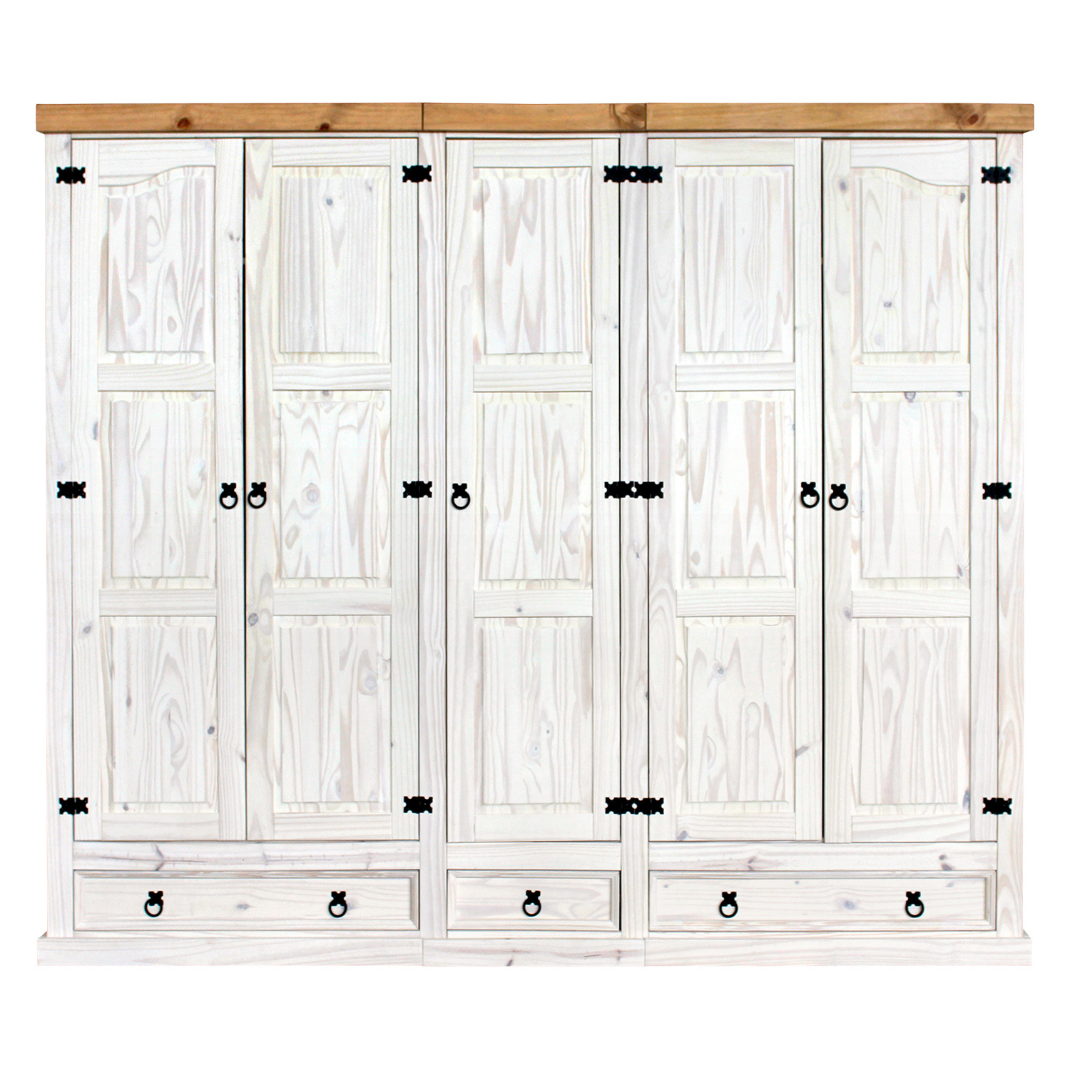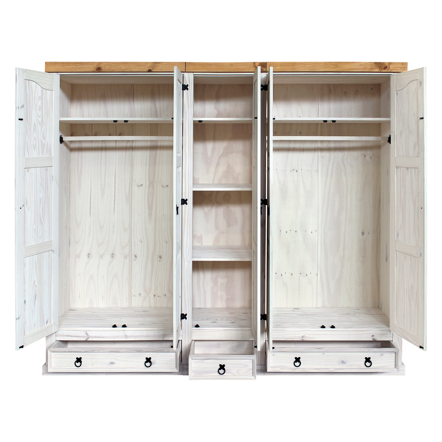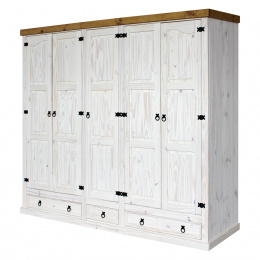 Šatní skříň je vyrobena z materiálu masiv borovice voskovaná v barevném provedení bílá. Horní deska skříně je v medovém odstínu. Prostor skříně je dělený v poměru 2:1:2,. Na obou krajích skříně jsou v širších částech šatní tyč a police na klobouky. Střední užší část se nacházejí 3 variabilní police. Ve spodní části skříně najdeme 2 velké a 1 malou zásuvku. Skříň má kovové ozdobné úchytky. Zboží dodáváme v demontu.